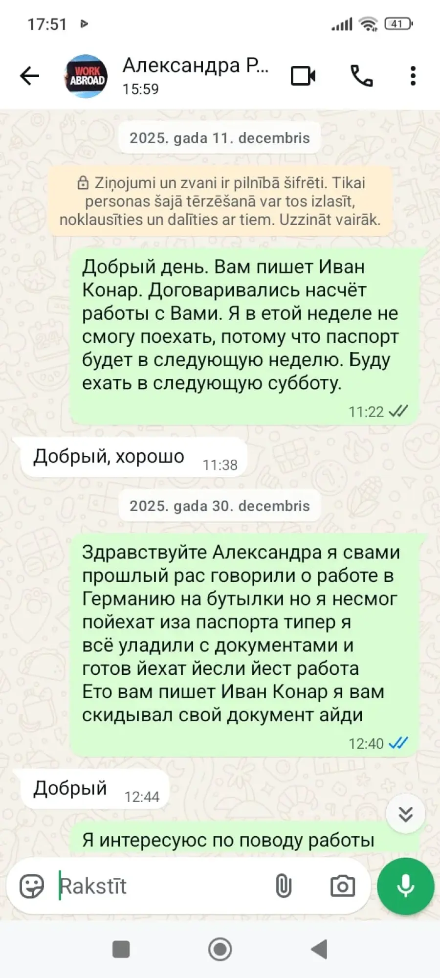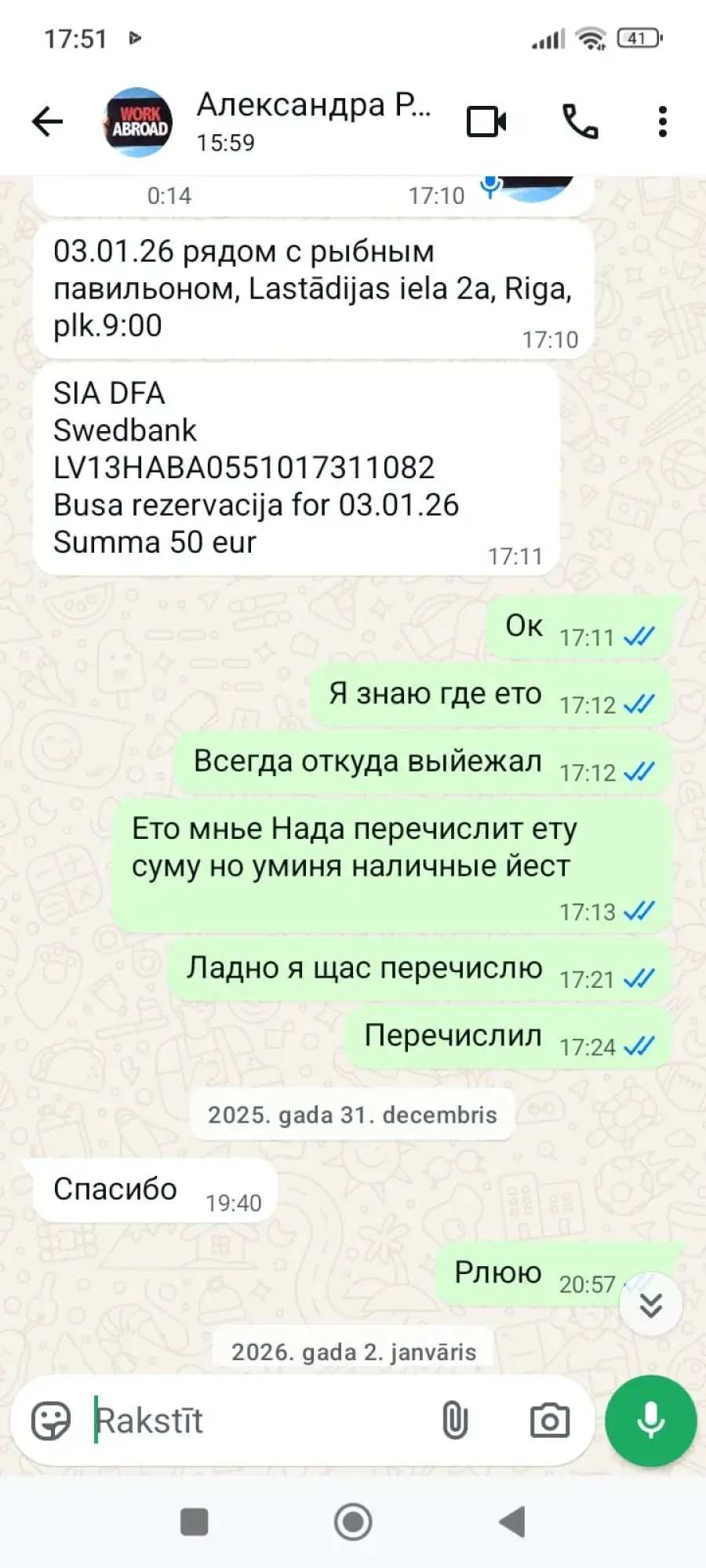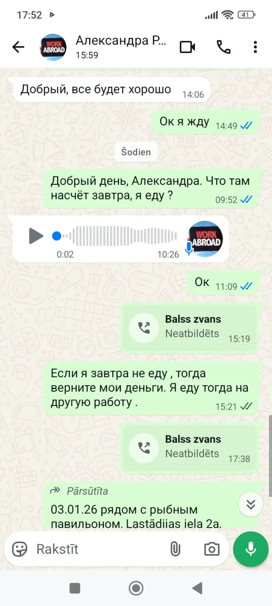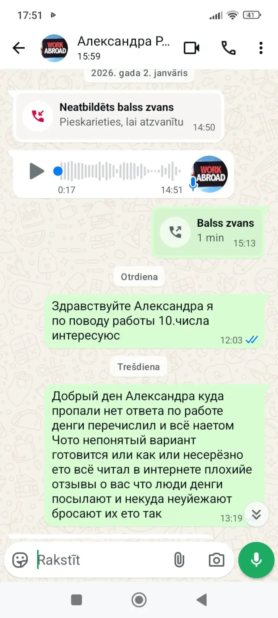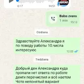 Sākotnēji tika norādīts, ka izbraukšana notiks 2026. gada 3. janvārī, vēlāk tā tika pārcelta uz 2026. gada 10. janvāri. 2026. gada 9. janvārī sazinājos, lai precizētu izbraukšanas detaļas, taču pēc solījuma sniegt informāciju pēc plkst. 12:00 saziņa tika pārtraukta. Atbildes netiek sniegtas, darbs nav nodrošināts, un samaksātā summa nav atmaksāta.