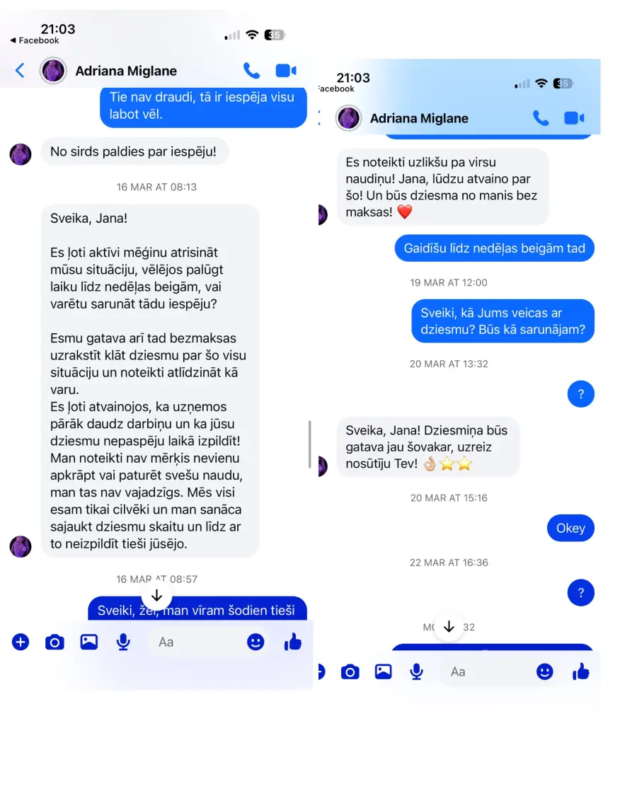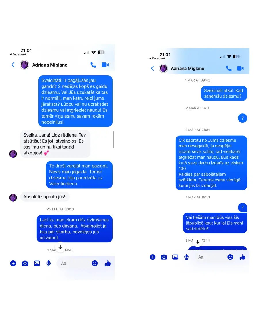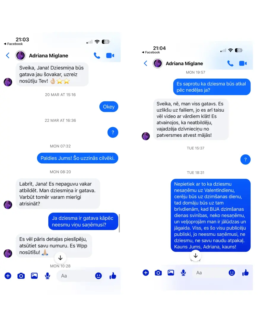 Pasūtīju dziesmu vīram uz Valentīndienu, pēc Adrianas ieliktā video tik tok, diemžēl dziesmu nesaņēmu un nauda arī netika atgriezta, no Adrianas puses saņemu tikai solījumus, ka dziesma būs gatava ir pēc kautkada noteikta laika,