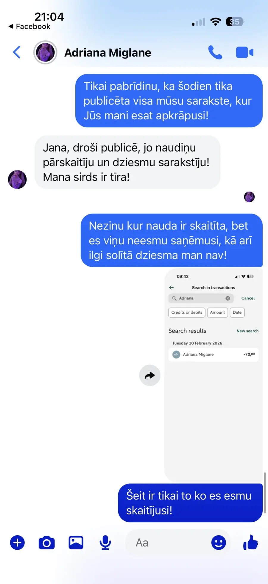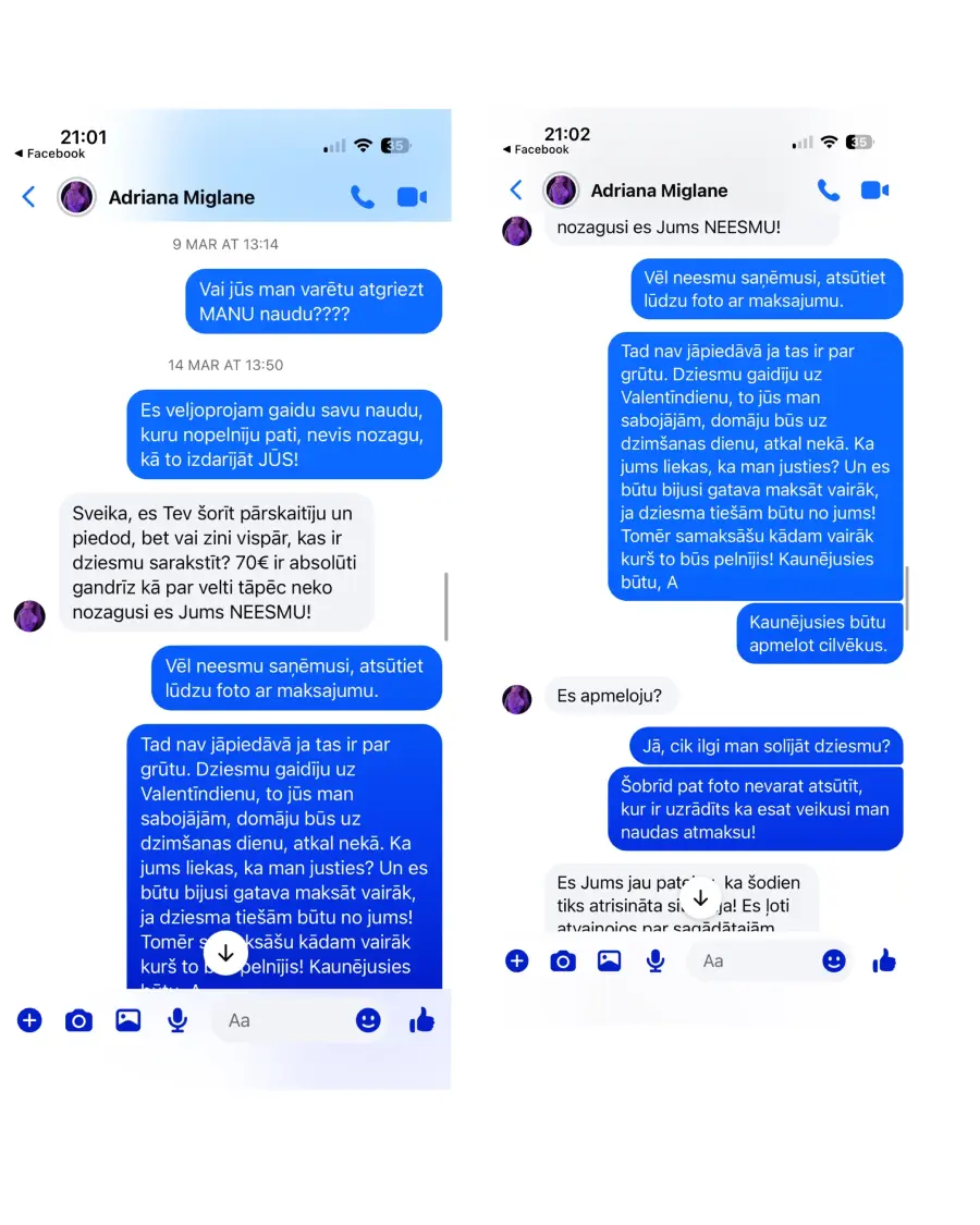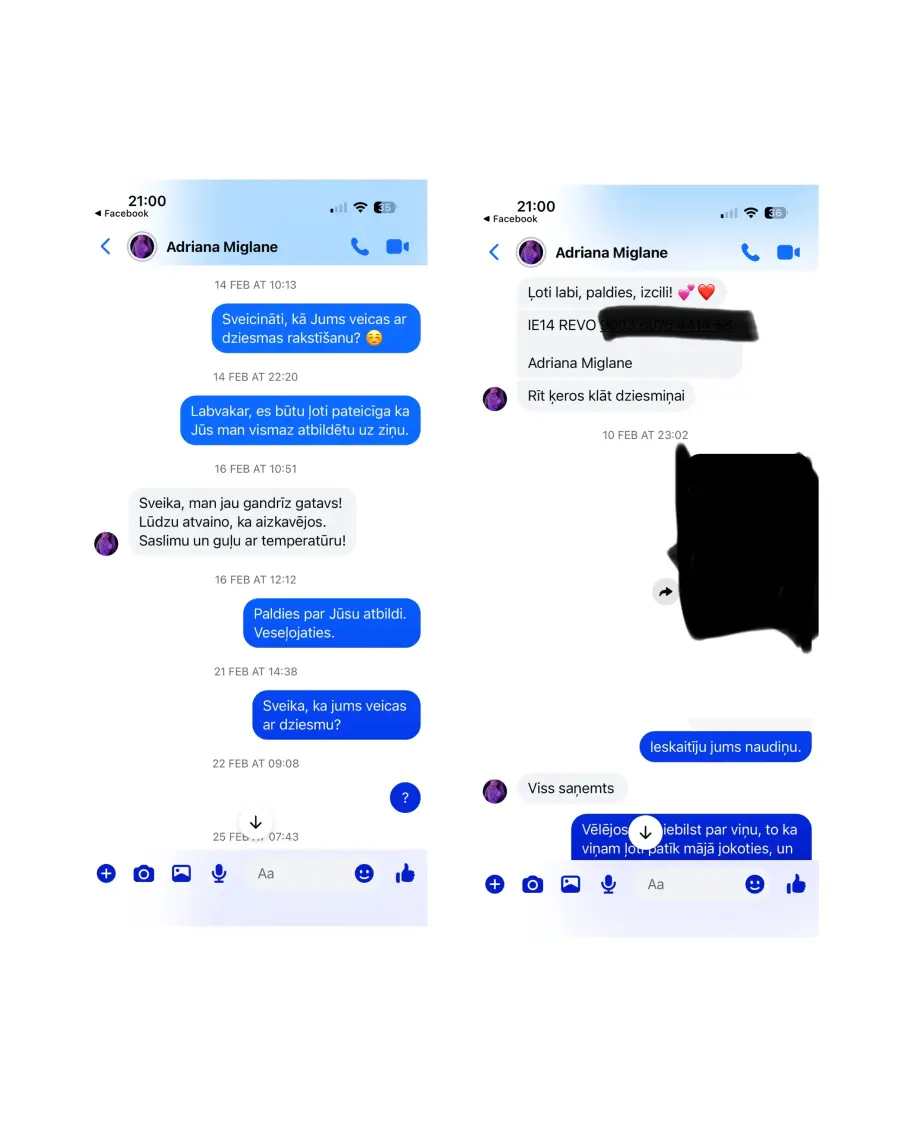 Pasūtīju dziesmu vīram uz Valentīndienu, pēc Adrianas ieliktā video tik tok, diemžēl dziesmu nesaņēmu un nauda arī netika atgriezta, no Adrianas puses saņemu tikai solījumus, ka dziesma būs gatava ir pēc kautkada noteikta laika,