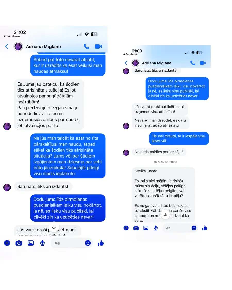 Diemžēl tiku maldināta mēneša garumā no Adrianas Miglānes puses, viss info redzams pievienotajos attēlos.