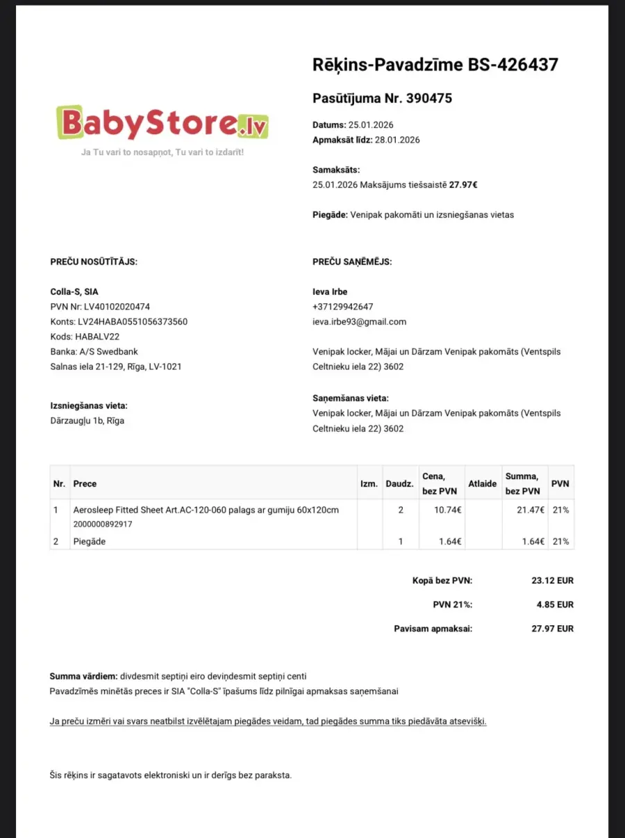 Interneta veikalā www.babystore.lv pasūtīju 2 Aerosleep firmas palagus. Biju ļoti nepatīkami pārsteigta, kad saņēmu savu pasūtījumu, jo Aerosleep palagu vietā tika atsūtīti 2 citu ražotāju palagi. Parasti, ja prece nav pieejama, tad veikala pārstāvim būtu jāsazinās ar pircēju un jāvienojas, ka pasūtītās preces varētu tikt aizvietotas ar citām (ja pircējs piekrīt) vai arī pasūtījums jāatceļ un jāatgriež nauda. Šajā gadījumā tā nenotika - pārdevējs patvaļīgi aizstāja pasūtīto ar citu preci - vienam no palagiem pat materiāls atšķiras. Uz e-pastiem ar lūgumu nodrošināt preču un naudas atgriešanu uzņēmums neatbild. Diemžēl tikai pēc tam internetā izlasīju daudzās sūdzības un to, ka arī ptac neiesaka no šī veikala neko iegādāties, jo cilvēki tiek apkrāpti, netiek saņemtas preces vai atgriezta nauda!