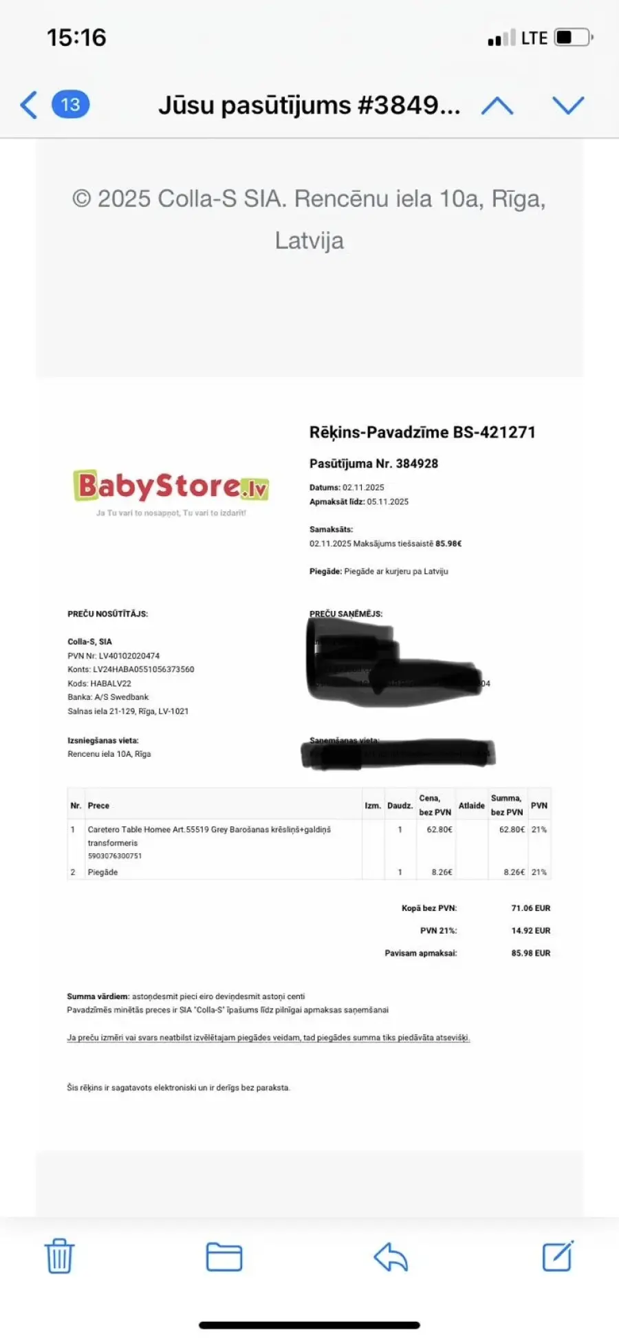 02.11.2025 pasūtījām bērnu barošanas krēsliņu + galdiņš , ko mēs tieši gribējām vairs ne bija mums pateica līdz 19.12.2025 būs atgriezta nauda , tomēr nauda nebija atgriezta , mēs piezvanījām , mums meitene piedāvāja kaut ko līdzīgu mums tas derēja , mēs vēl uzprasījās vai šis ir uz vietas , mums atbildēja šis ir pieejams,pateica 7dienu laika būs , bet šodien ir 15.01.2026 nav ne galdiņa ne naudas , klausili man nometa , uz manējo numuru necel klausili , piezvanu no cita numura tad atbild
