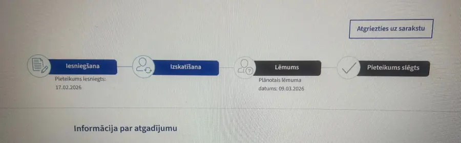 Saskaņā ar BALTA sniegto informāciju sākotnējais plānotais lēmuma pieņemšanas termiņš bija 03.03.2026, kas vēlāk tika pagarināts līdz 09.03.2026. Uz 12.03.2026 lēmums joprojām nav pieņemts, kā arī nav sniegts paskaidrojums par kavējuma iemesliem.