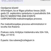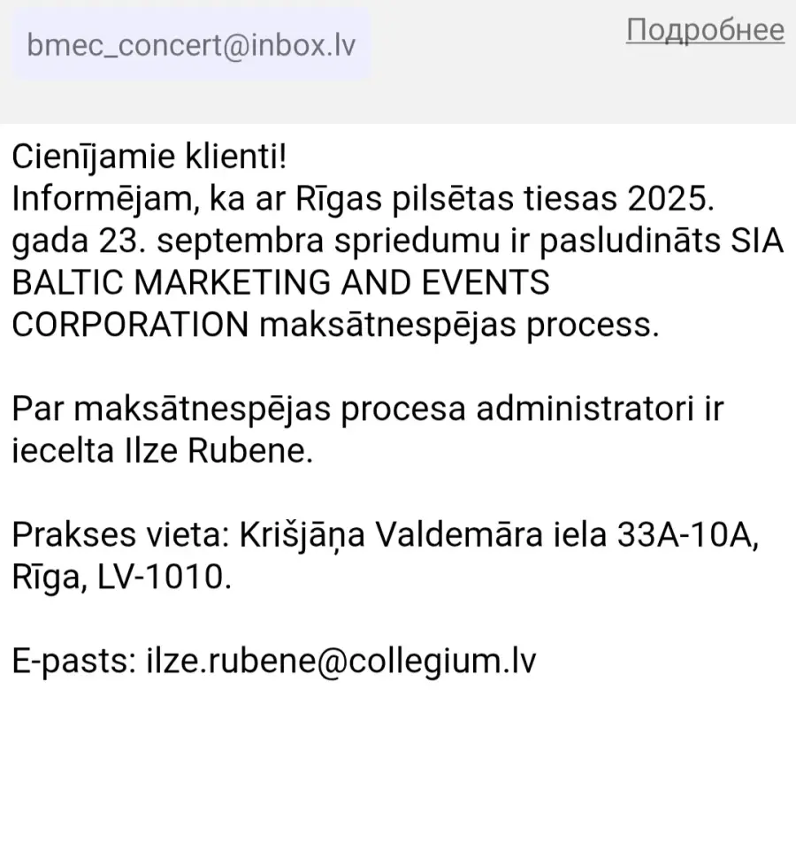 Koncerts tika atcelts bez jebkāda brīdinājuma, bet, pieprasot naudas atgriešanu, es saņēmu atbildi, ka par biļetēm it kā atbild kāds “SIA Baltic Marketing and Events Corporation”, kuru tiesa pasludinājusi par maksātnespējīgu.