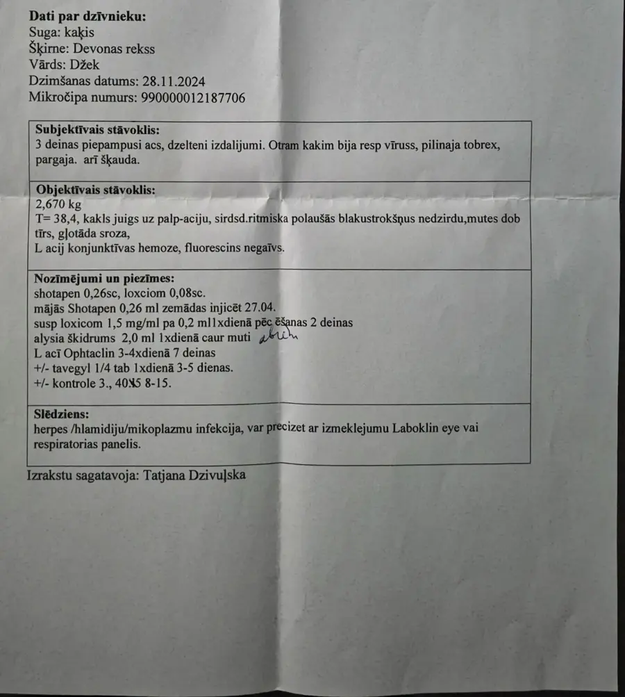 Tomer ir jāpiebilsts, ka mūsu vetārstam radījās šaubas par to, ka audzetaja nezināja par slimību, bet noteikt to uz 100% nevareja.