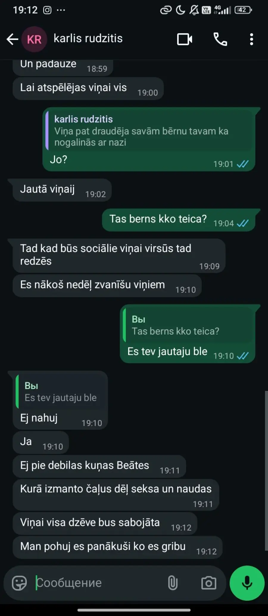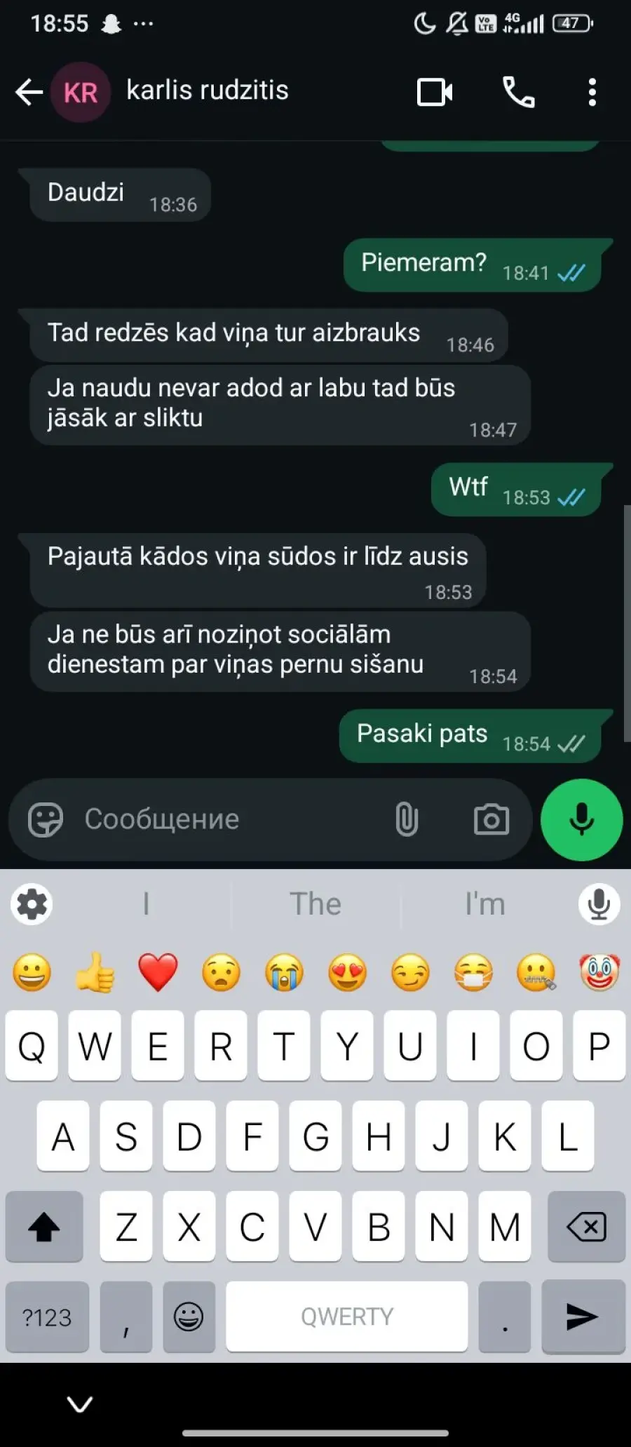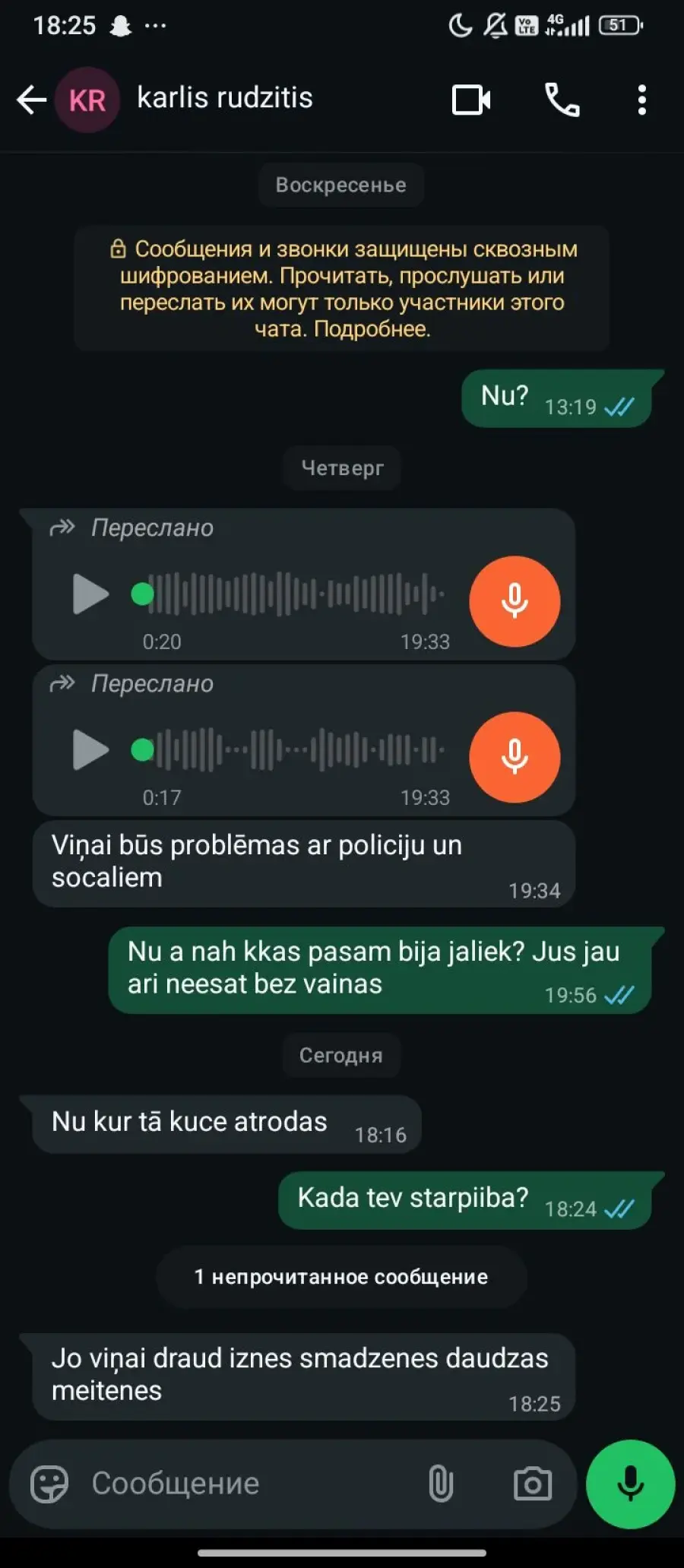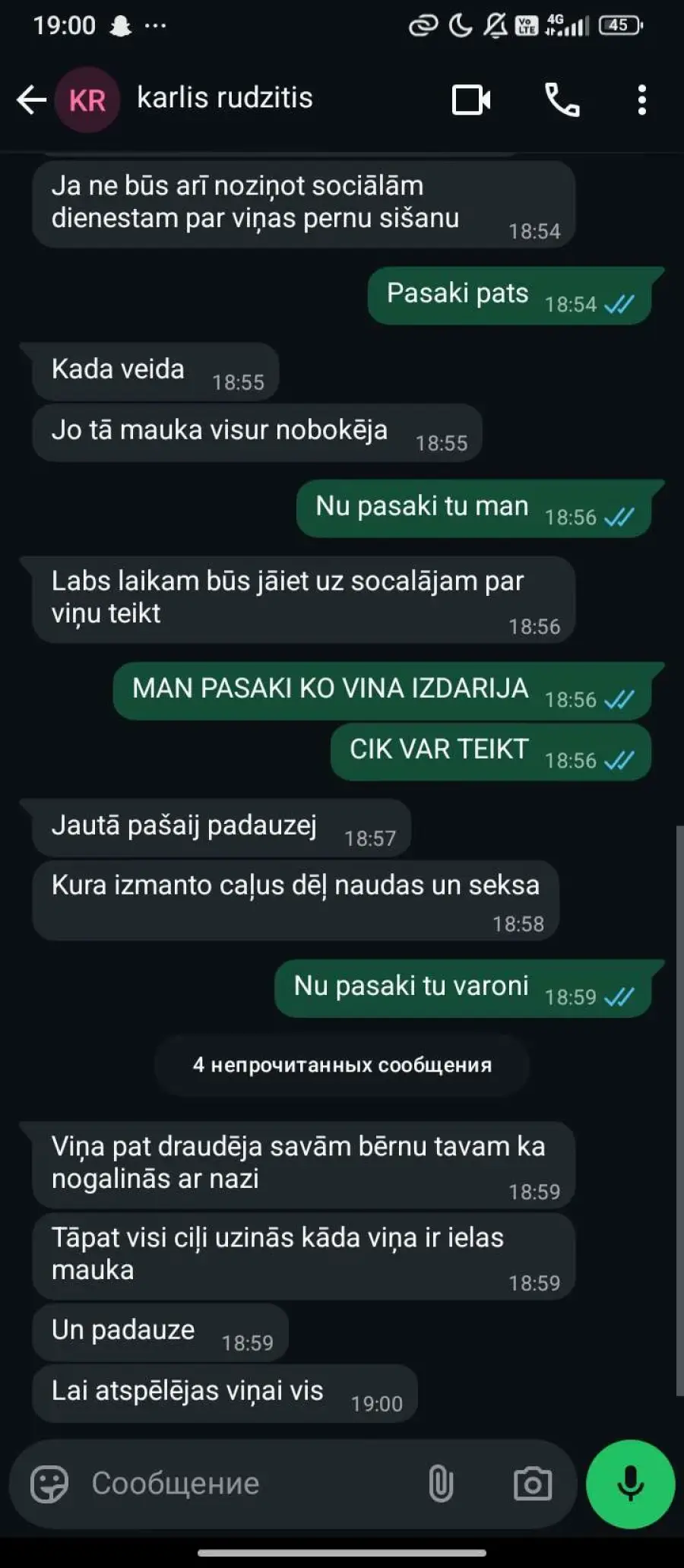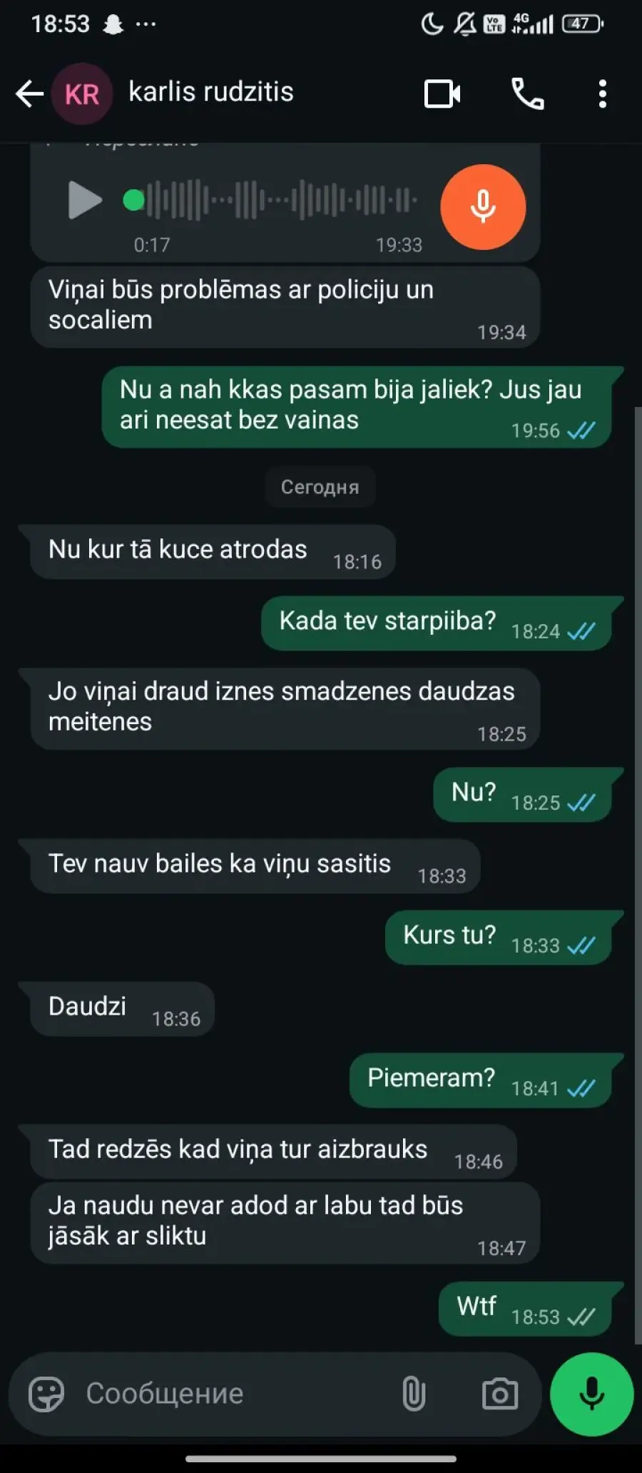 Vēlos izteikt sūdzību par jūsu darbinieku Kārli Rudzīti. Vēršos pie jums tādēļ ka, no jūsu darbinieka puses tiek izteikti fiziski draudi par to kas nav taisnība, draud ar izrēķināšanos. Mans pacietības mērs ir pilns, jo es nepieļaušu ka aizskar mani vai manu ģimeni. Viņa dēļ mums ir bail iziet uz ielas ārā, jo var notikt viss kaut kas.