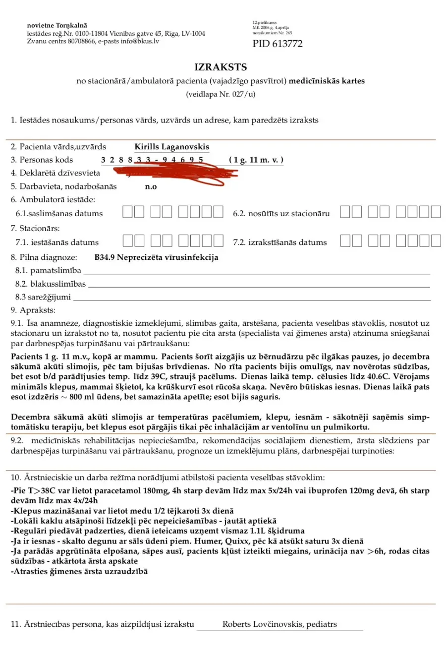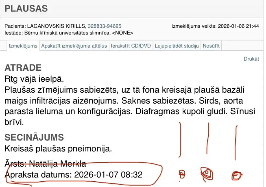 Bērns bija slims kopš 4. decembra. Viņam parādījās sauss klepus, pēc tam slapjš. Mēs viņu ārstējām mājās, izmantojot visas iespējamās ārstēšanas metodes un medikamentus, ko izrakstīja ģimenes ārsts. Beigās palīdzēja tikai inhalācijas. Bērns atveseļojās Latvijas svētku laikā. 5. janvārī mums bija pieraksts pie ģimenes ārsta, kurš apskatīja bērnu, uzklausīja viņu un izrakstīja izziņu, ka viņš ir vesels. 6. janvārī bērns devās uz bērnudārzu, kur es viņu paņēmu pēc 10 minūtēm ar 39.0 grādu temperatūru. Mājās temperatūra paaugstinājās līdz 40,8 °C, un mēs nolēmām doties uz bērnu slimnīcu. Tur mēs satikām Dr. Robertu Lovčinovski, kurš nozīmēja asins analīzes, urīna paraugu, vīrusu un gripas testus, kā arī krūškurvja rentgenu. Pēc ārsta teiktā, analīžu rezultāti bija normāli, plaušas bija kārtībā, un nekas netika atrasts. 6. janvārī plkst. 23:00 ārsts nesagaidot rentgena rezultātus teica, ka varam doties mājas, lai gan bērna temperatūra bija 39,0 gradi un ārā nebija vasara. Tā nu mēs ar divgadīgo bērnu devāmies mājās plkst. 23:00. Ārsts pat neapsvēra iespēju mūs atstāt slimnīcā pa nakti; tā vietā viņš mūs aizsūtīja mājās. Krūškurvja rentgena rezultāti bija gatavi nākamajā rītā, un tajos tika konstatēta LABĀS PLAUŠU PNEIMONIJA! Mums par to neteica, un arī izrakstā,ko ārsts man iedeva uz rokām nebija vispār rakstīts par to,ka bērnam bija taisīts rentgents plaušām! Ārsta slēdziens bija : “NEPRECIZĒTA VĪRUSINFEKCIJA”! Un mums nebija ne jausmas, ka kaut kas nav kārtībā. Drudzis nepazeminājās, un bērnam neklājās labāk. 10. janvārī mēs atgriezāmies slimnīcā, bet šoreiz ar stomatītu. Beidzot mūs sāka ārstēt un ievietoja infekcijas slimību nodaļā. Es tikai gribu pateikt, ka nekad neesmu redzējis tādu vienaldzību no ārsta, kas ārstē bērnus! Nevienam neiesaku sadarboties ar šo ārstu! Tagad bērns cieš viņa nolaidības dēļ! Ziņošu šo informāciju visiem iespējamiem dienestiem un organizācijām un ceru, ka šis "ārsts" tiks saukts pie atbildības!