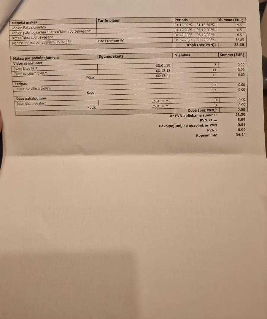 Sākšu ar to, ka Bite nekādā veidā nav sazvanāma! 1601 (info tālrunis) nedarbojas jau vairākas nedēļas, numurs neeksistējot. Zvanīju vēl uz 6 dažādiem Bite veikalu numuriem, neatbildēja NEVIENS! 8. decembrī pilnībā pārgāju uz LMT, jo Bite man, ilggadējam klientam, apmēram 13.gadi, labākais, ko varēja piedāvāt no bezlimitu tarifiem, bija pa 34,24... pieminēšu, ka gadu man jau ir maksātnespēja. Teica, ka šis tarifs mani nekur "nepiesienot", līguma nav un varu atteikties, kad vien vēlos. Palēnām atteicos no visiem viņu pakalpojumiem - go3, interneta, jo kopsumma ar tarifu man bija pa dārgu. Visus šos gadus rēķinus esmu maksājusi laicīgi, nekad nekavēju, pat apmaksāju vairākas dienas pirms norādītā datuma. 28. vai 29. novembrī pieteicos LMT. 1. decembrī saņēmu zvanu no LMT, parakstīju līgumu, gaidīju SIM karti, kuru man atsūtīja 3.decembrī. Taču pilnīga pāreja notika 8.decembrī. Līdz tam, protams, Bite zvanīja un piedāvāja man palikt pie viņiem, piedāvājot bezlimita tarifu pa 8 eiro! Kur bijāt pirms tam, kad lūdzu? Es jau biju nikna uz Biti un nolēmu pāriet uz LMT, jo viņi piedāvaja bezlimitu tarifu un Netflix, kur viss kopā izmaksā lētāk nekā man Bitē TIKAI tarifu plāns. Pienāca janvāris un man atnāk rēķins no Bites, ka jāmaksā PILNA summa par decembri - 34,24.. kaut izmantoju tikai līdz 8.decembrim, jo pāreja uz LMT ievilkās.. pat ne manas vainas dēļ. Visu darīju, pildīju, parakstīju uzreiz. Ātrāk gribēju tikt prom no Bites. Tad nu tagad, man ar savu maksātnespēju un dusmām uz Biti, jāmaksā diviem operatoriem, kaut pie Bites lielāko daļu mēneša jau sen biju prom. Pielikumā rēķins, kuru šodien man izprintēja Bites salonā, norādīja ar pirkstu, ka - jā, jūs izmantojāt līdz 8.decembrim, bet tur neko nevar darīt, jāmaksā tāpat. FUJ Bitei! Tos mini burtus līgumos neviens nelasa, jo nevar salasīt un mani neviens nepabrīdināja, ka ja aiziešu mēneša sākumā, tad dabūšu maksāt pa pilnu programmu. Pie pēdējā maksājuma Bitei, pierakstīju - Priecājos, ka ar Jums vairs nesadarbošanos! Un tiešām priecājos!