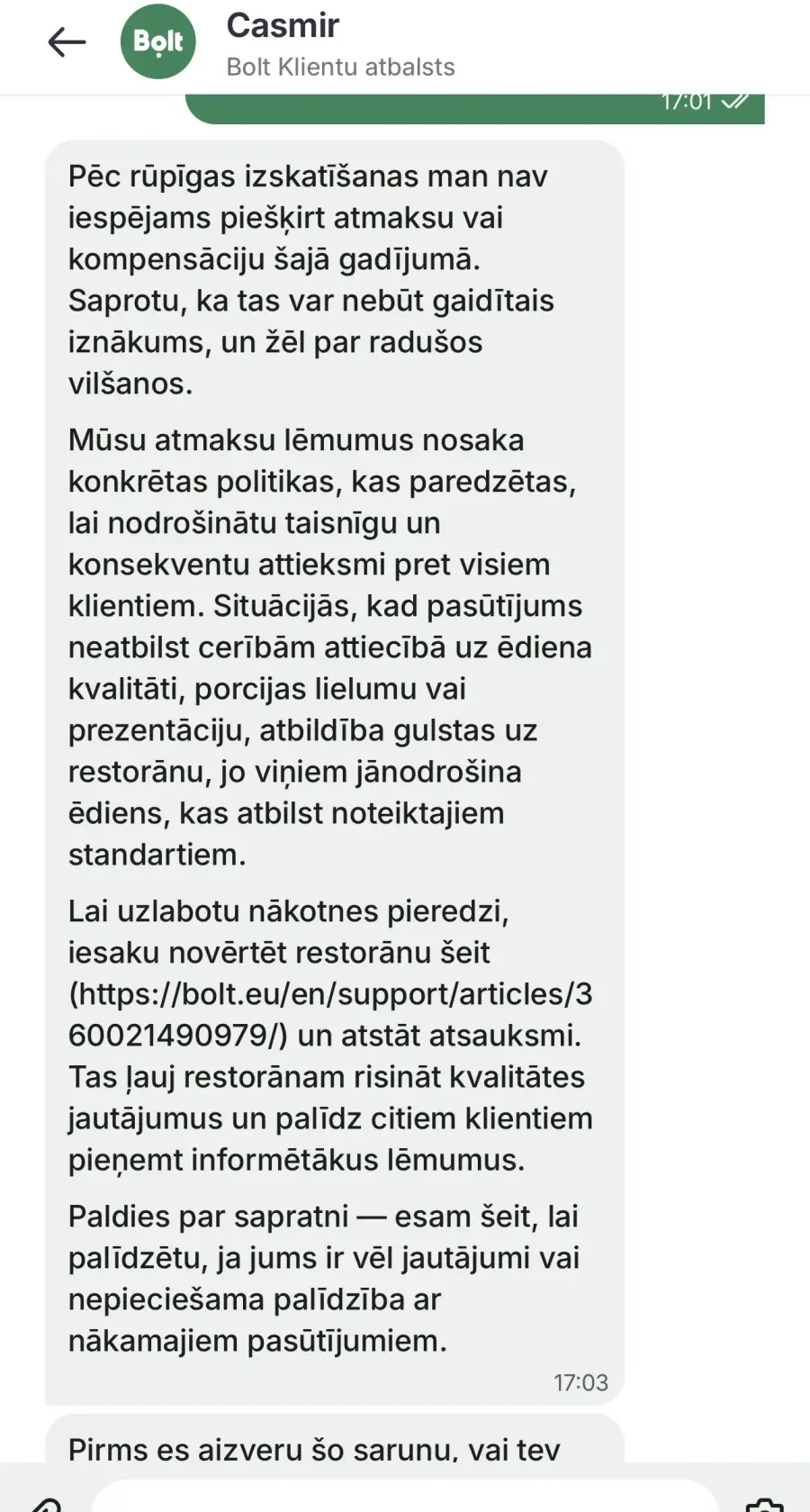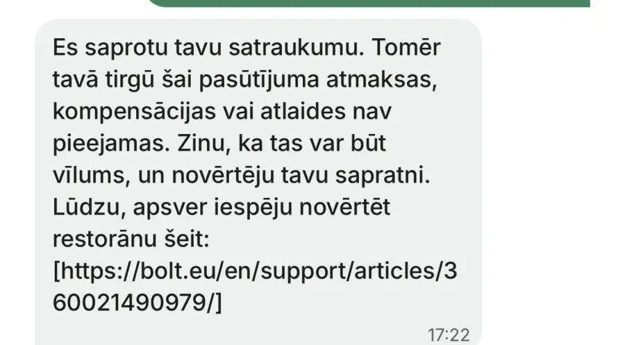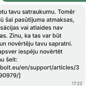 Saņemot nepareizu pasūtījumu no ēdināšanas uzņēmuma, nekavējoties iesniedzu pretenziju Bolt atbalsta dienestam, detalizēti aprakstot situāciju un pievienojot attēlus, kas to nepārprotami apliecina.