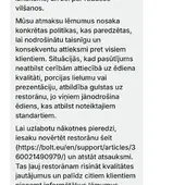 Papildus tika norādīts, ka gadījumos, kad pasūtījums neatbilst cerībām (piemēram, kvalitātes, porcijas lieluma vai noformējuma ziņā), atbildība gulstas uz restorānu, un tika ieteikts atstāt atsauksmi, lai uzlabotu nākotnes pieredzi.