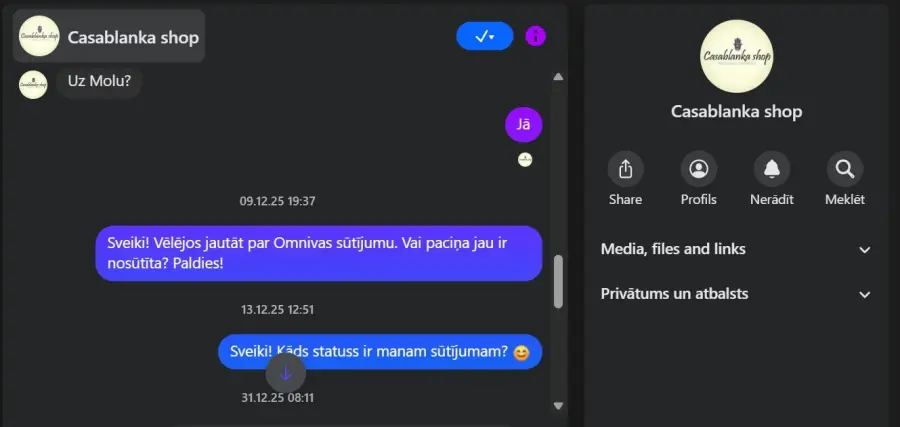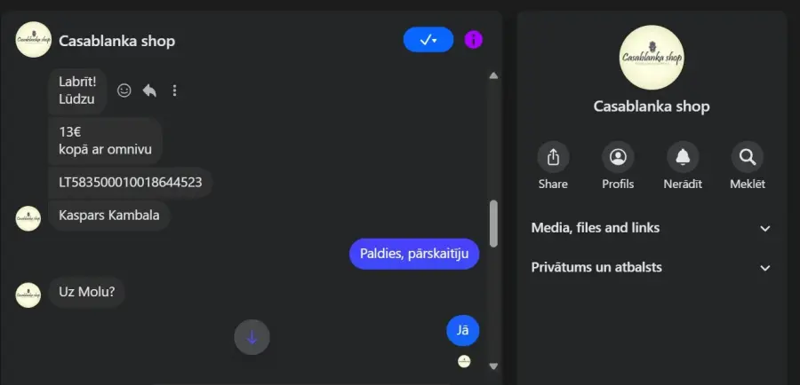 Vēlos brīdināt visus potenciālos pircējus par Facebook "Casablanka shop" lapu un Instagram casablanka_shop, ko pārvalda Olga Kambala. 23.novembrī veicu pasūtījumu Facebook lapā, kā arī pēc Olgas lūguma veicu apmaksu uz Kaspara Kambalas kontu. Pēc pāris nedēļām, nesaņēmusi preci, centos sazināties gan caur Instagram, gan Facebook lapām. Ziņas pēc naudas saņemšanas nelasa! Ne preces, ne naudas! Pati īpašniece, Olga Kambala, mani ir nobloķējusi Facebook, kas izsaka visu.