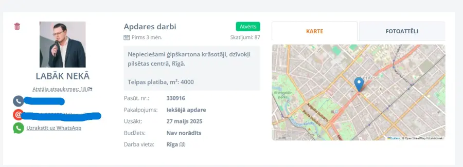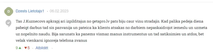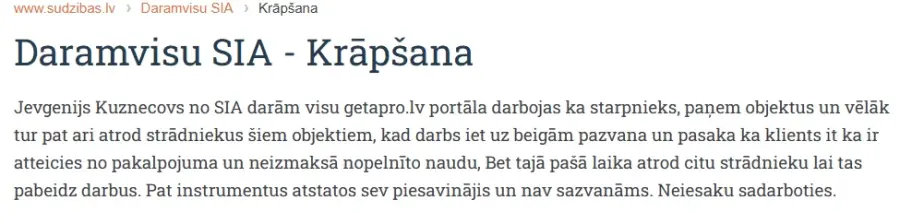 Mana pieredze ar šo indivīdu - Šī persona mani uzmeklēja, ar piedāvājumu izveidot komandu, kas veiktu visus noteiktos būvniecības darbus. Piedāvājums bija noslīpēt sienas un tas nokrāsot, kas darba gaitā bija mēli, jo sienas bija drausmīgas un tas nācās pāršpaktelēt, bet mēs to atrisinājām ar norunu, ka cena būs lielākā pa darbiem. Protams nāca vēl visādi papildus darbi, par ko teica ka visu maksas, galvenais izdarāt. Kad viss bija izdarīts, viņš samaksāja, ja labi 60% no summas un teica ka pasūtītājs nav samaksājis, bet visu viņš nokārtos un viss tiks samaksāts !