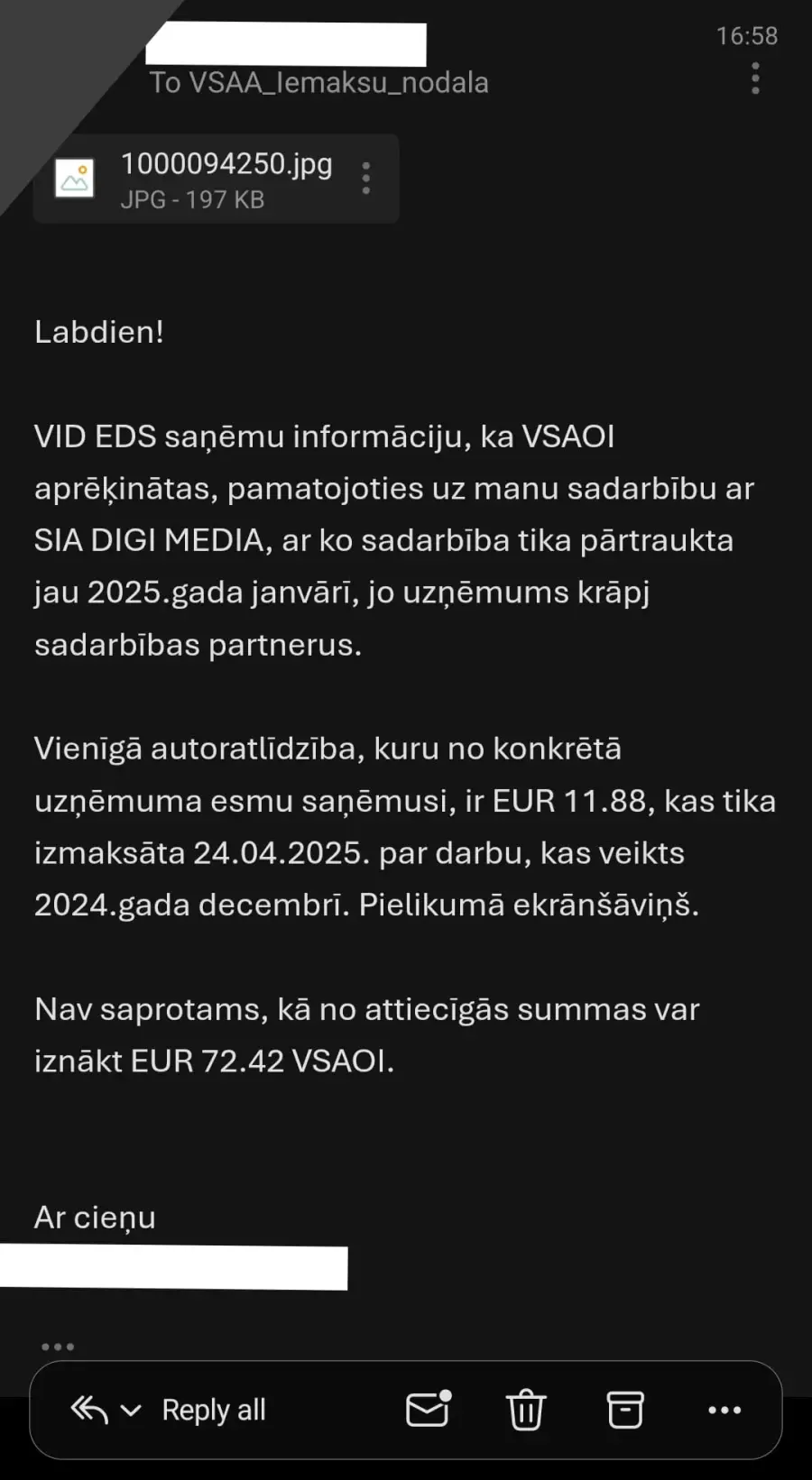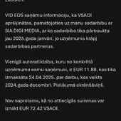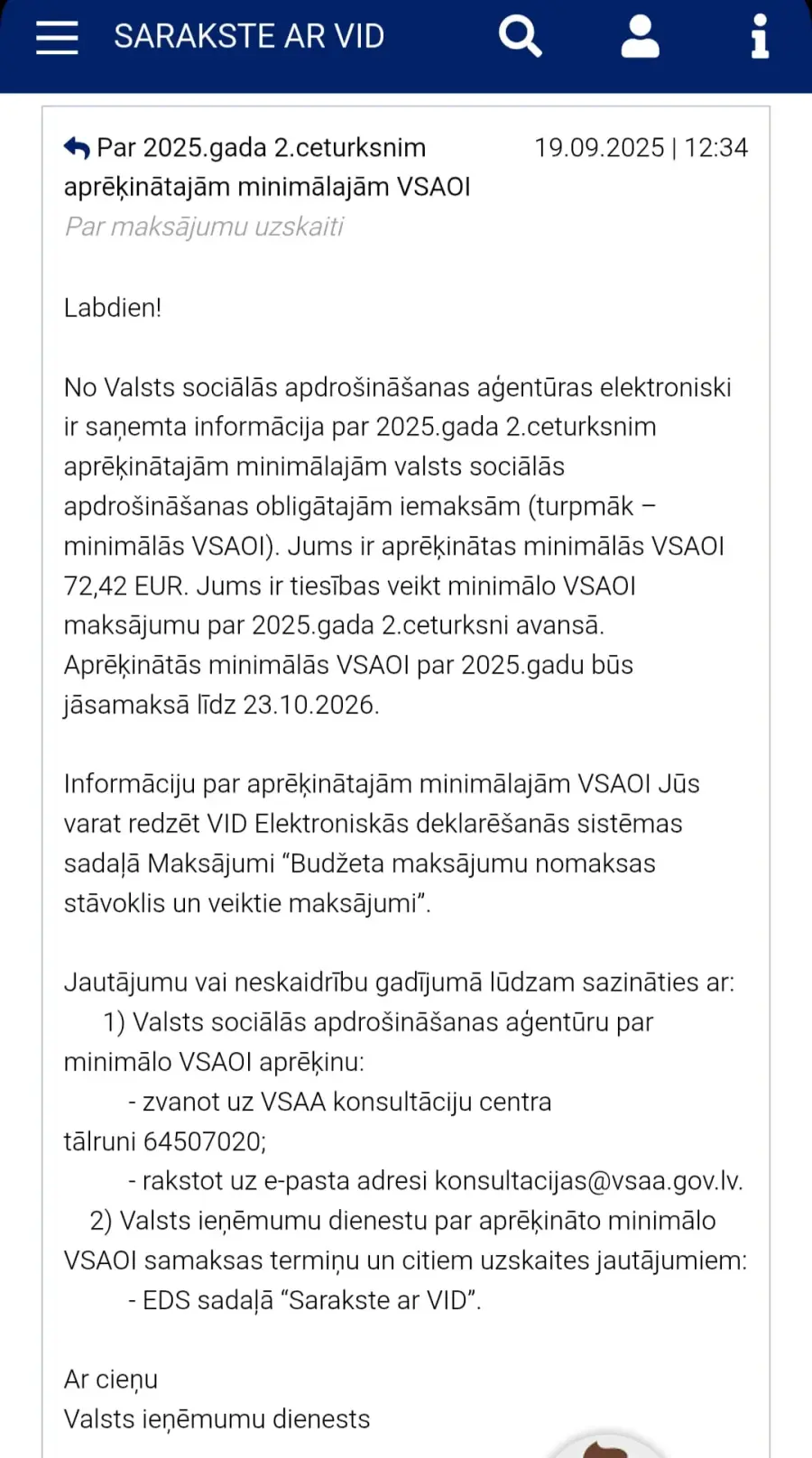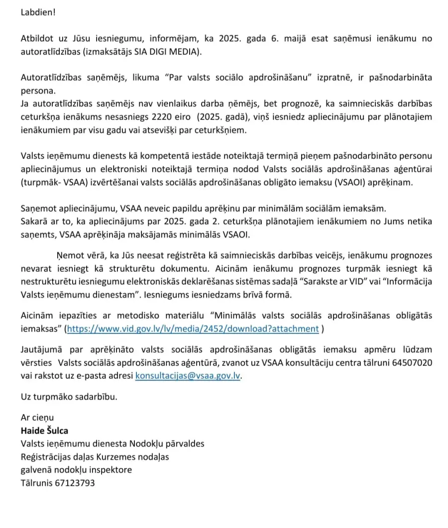 2025.gada 19.septembrī VID EDS saņemu paziņojumu no VID, ka man esot aprēķinātas valsts sociālās apdrošināšanas obligātās iemaksas (VSAOI) EUR 72.42 apmērā par laika periodu no 01.04.2025. līdz 30.06.2025. Nesapratu, kas tas ir, jo konkrētajā laika periodā nekur neesmu bijusi nodarbināta. 2025.gada 23.septembrī no VID saņēmu ziņu, ka VSAOI aprēķinātas sakarā ar to, ka es saņemot autoratlīdzību no SIA Digi Media, ar kuru sadarbība pārtraukta jau 2025.gada janvārī. Respektīvi, no manas autoratlīdzības EUR 11.88 esot aprēķinātas VSAOI EUR 72.42 apmērā.