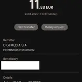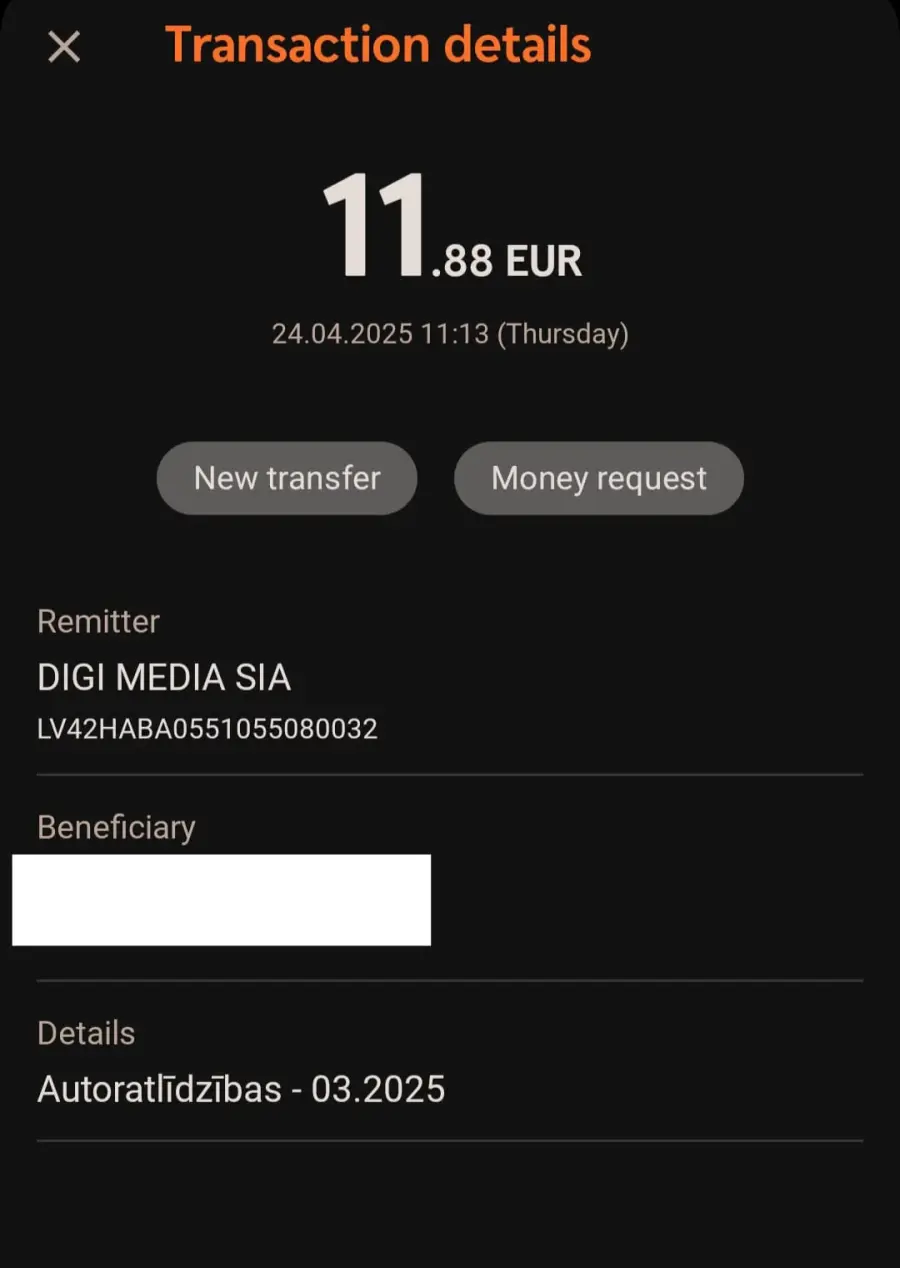 Pieņēmu, ka darba samaksu nesaņemšu vispār, līdz 2025.gada 24.aprīlī bankas kontā ienāca maksājums no SIA Digi Media EUR 11.88 apmērā. Pasmējos par niecīgo summu un jutos atvieglota par to, ka sadarbība pārtraukta.
