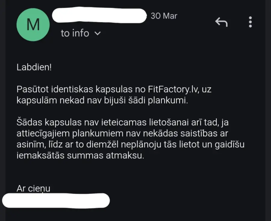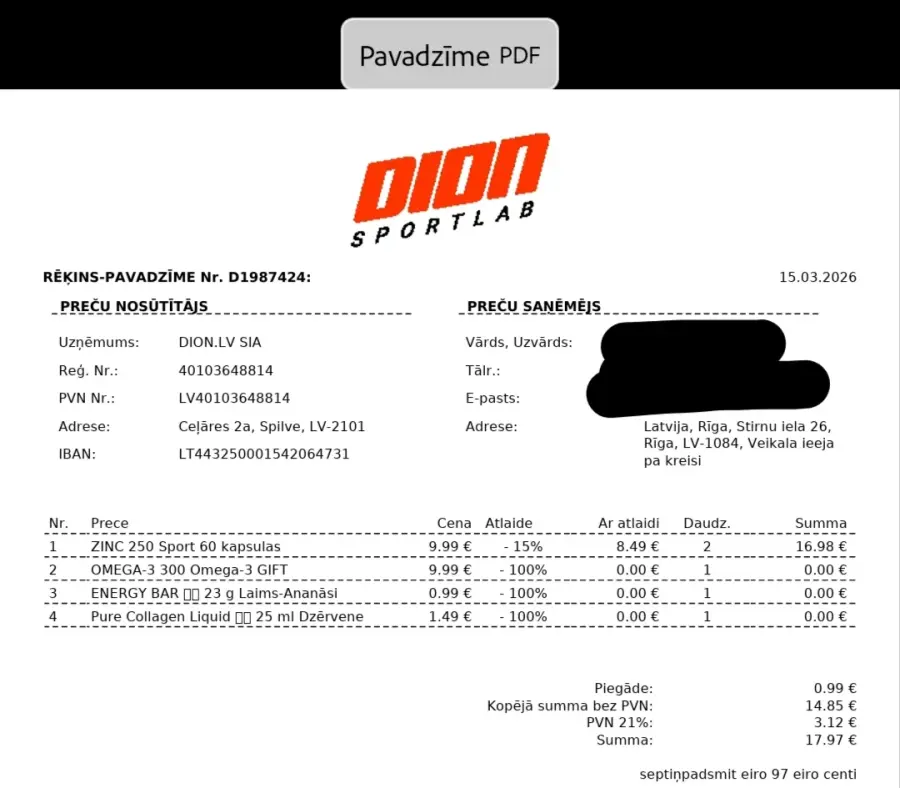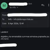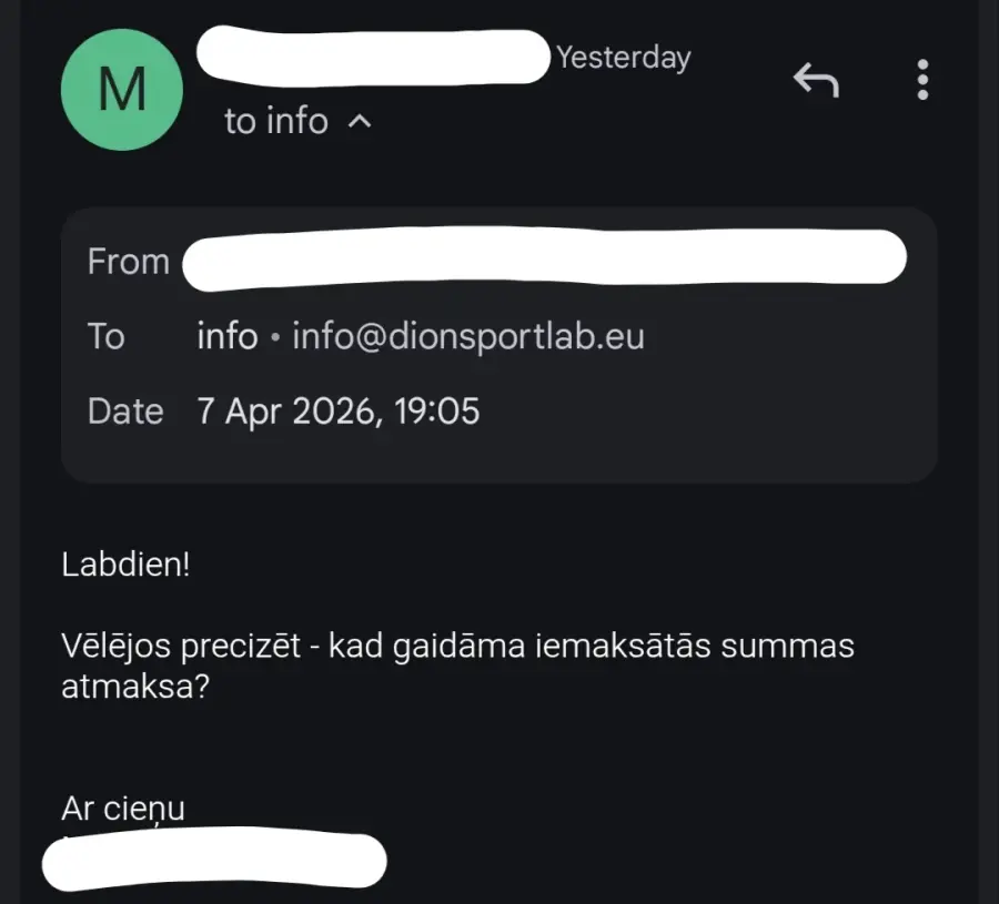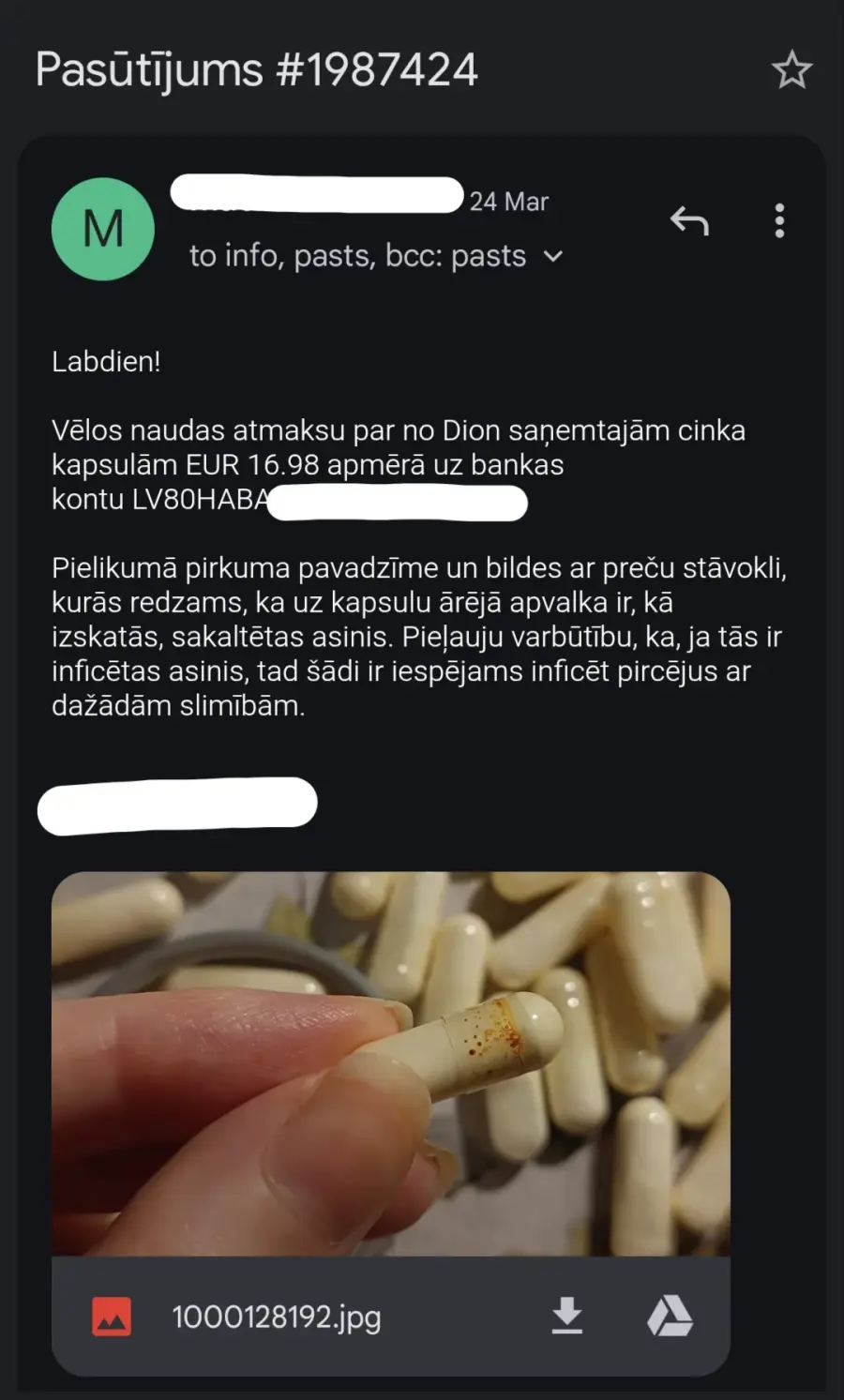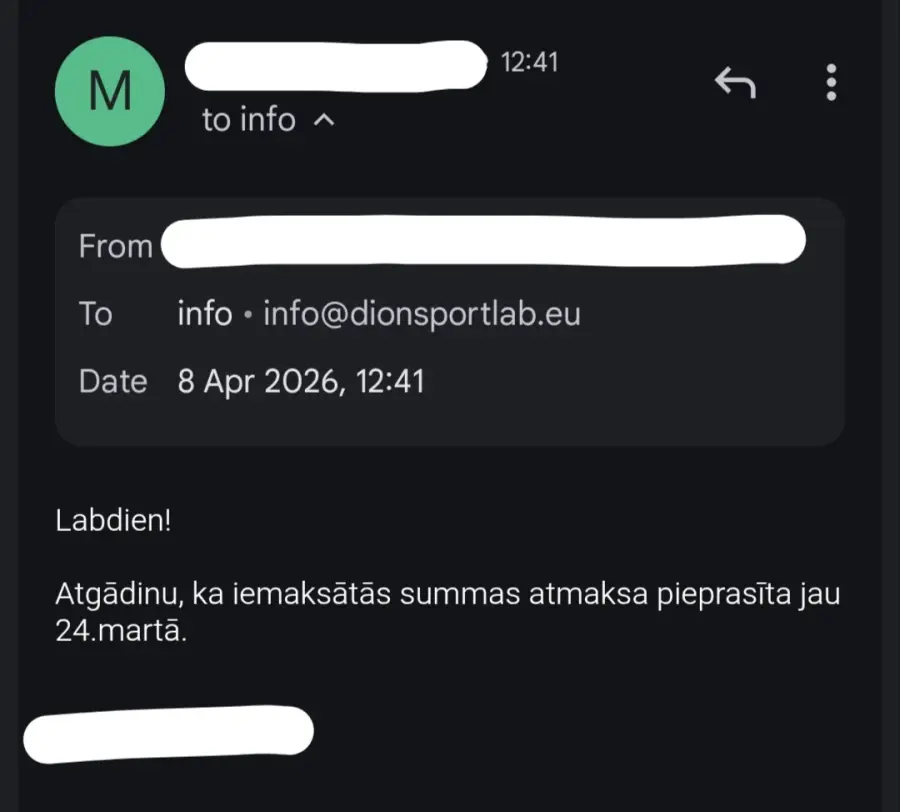 15.03.2026. www.dion.lv iegādājos ZINC 250 Sport 60 kapsulas (2 iepakojumus, pasūtījuma numurs 1987424). Saņemot preci, konstatēts, ka abos iepakojumos ir kapsulas ar sarkanbrūniem pleķiem, kuras līdz ar to nav ieteicamas lietošanai. Kā arī, pasūtot identisku preci no www.fitfactory.lv, šādas problēmas nekad nav bijušas. 24.03.2026. tika pieprasīta iemaksātās summas atmaksa, uz ko Dion reaģēja ar e-pasta ziņu, ka “var veikt naudas atmaksu”, it kā neizteicos pietiekami skaidri par to, ka vēlos iemaksātās summas atmaksu un viņu atbildes e-pasta ziņa automātiski atceļ manis rakstīto. 30.03.2026. atmaksa joprojām netika saņemta, kompānijai nosūtīta papildus e-pasta ziņa ar atkārtotu lūgumu atgriezt iemaksāto summu, uz ko atbilde nav saņemta vispār. 07.04.2026. atmaksa joprojām netika saņemta, nosūtīta atkārtota e-pasta ziņa, uz kuru arīdzan nav saņemta atbilde. 08.04.2026. atmaksa joprojām netika saņemta, nosūtīta e-pasta ziņa ar atgādinājumu par to, ka atmaksa joprojām nav saņemta – uz ko ARĪDZAN atbilde NAV saņemta.