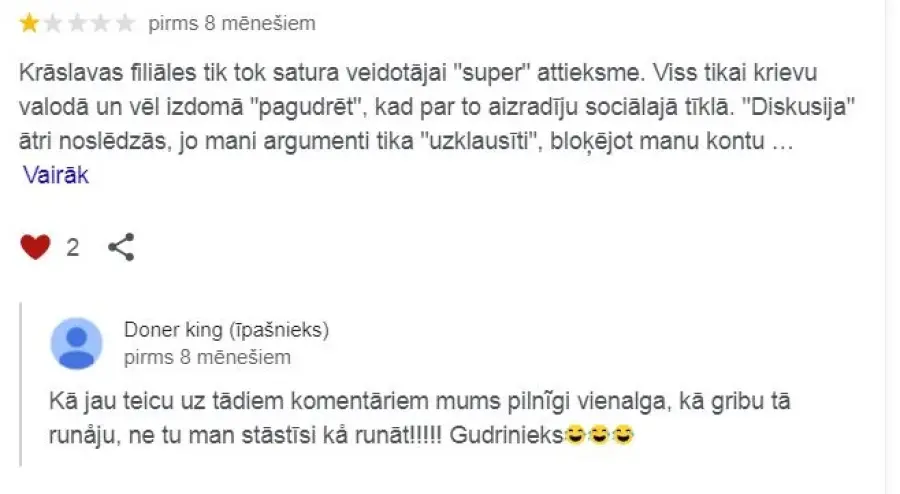 Darbiniecei, kas veido Krāslavas filiāles tik tok saturu "lieliska" attieksme. Viss saturs tikai krievu valodā. Kad aizrādīju, ka nepieciešams vairāk satura latgaliešu/latviešu valodā, saņēmu nomelnojošu atbildi video komentārā. Mūsu "diskusija" nebija Ilga, jo ātri vien tiku nobloķēts. Nožēlojami! Ja pārstāvim tāda attieksme, nekad neiesaku apmeklēt!