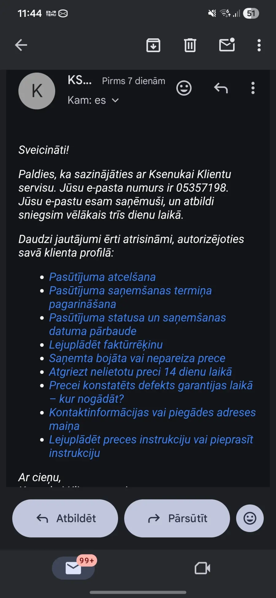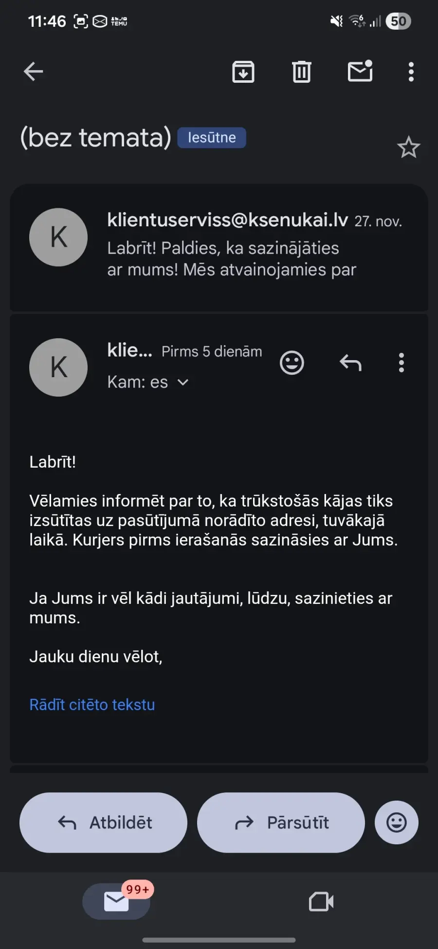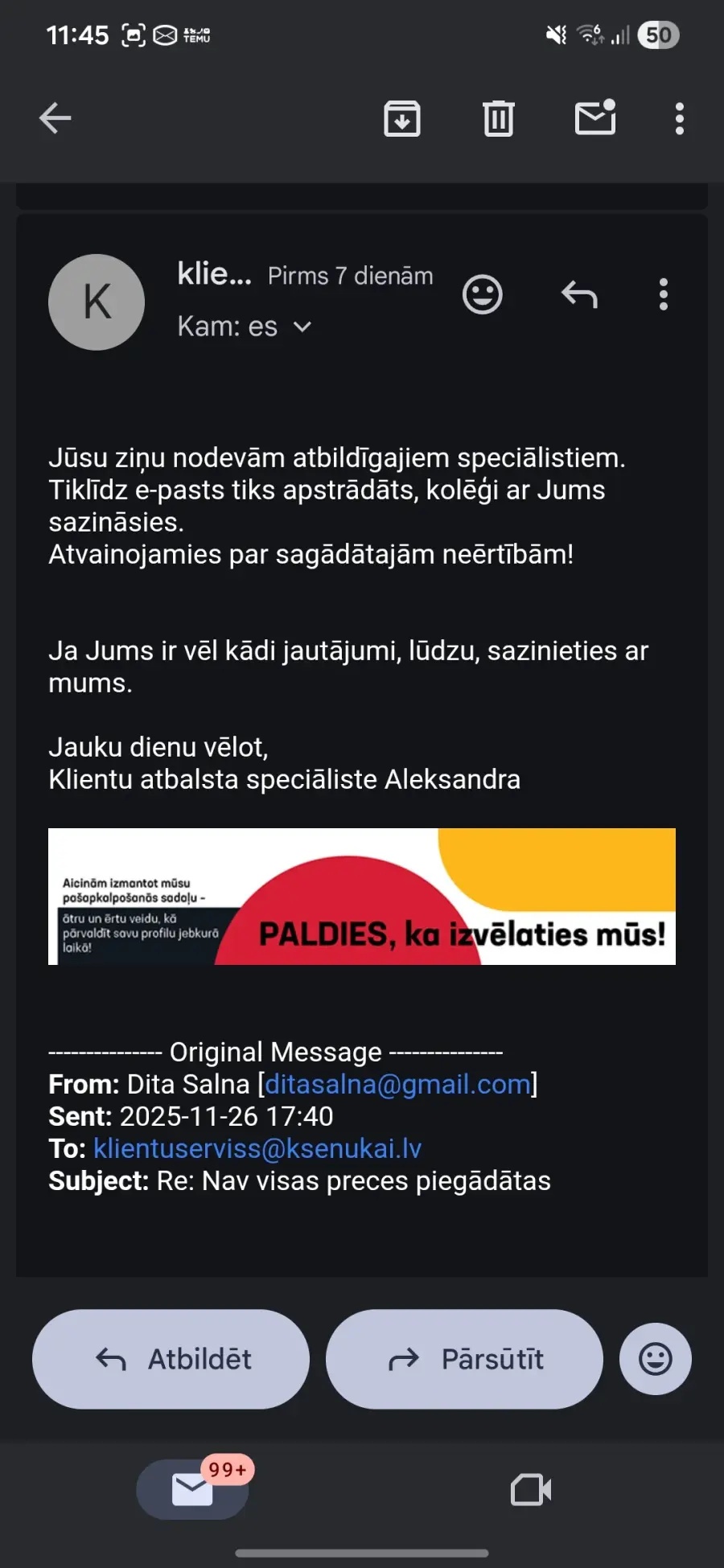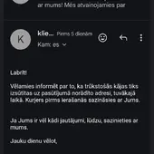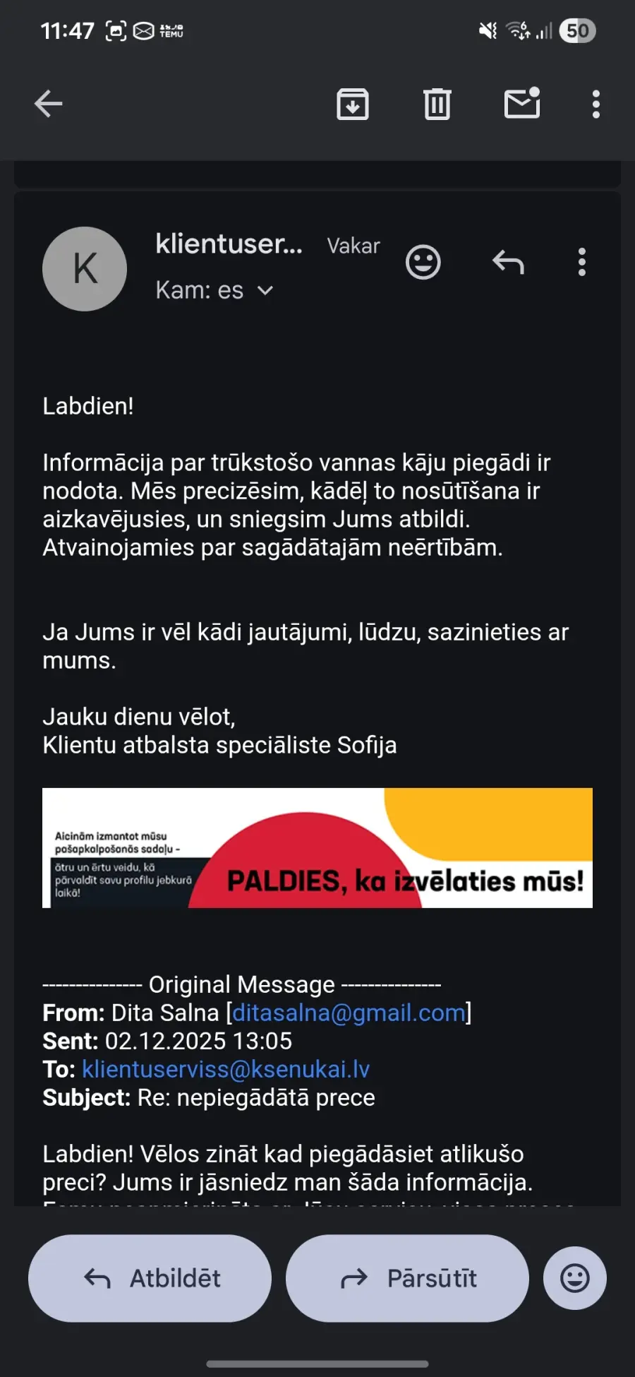 Iegādājos vannu ar visu nepieciešamo uzstādīšanai, nopriecājos pasutīju 23.11. un piegādāja 25.11. nodomāju ka tik ātrs servis varēšu uzstādīt, bet protams prece tika piegādāta bez vienas sastāvdaļas vannas kājam, dēļ kā nevar nekādīgi uzstādīt vannu, šīs viss stāv neatpakots uz vienas nekustīgs kas rada lielu jucekli, jo šis risinās jau nedeļu, biju domājusi ka viņu vaina tātad ātri atrisinās radušos sitvāciju, bet komunikācija nekāda, zvanu intresējos pati, uz epastiem atbild ar vairāku dienu nobīdi, konkrētas atbildes nav, kad būs piegādats, neizrāda nekādu lielu pretīmnākšanu, takā tā būtu mana vaina, jau nedēļu gaidu, kad piegādās vannas kājas, šī Sofija kas atbild par manas sitvācijas risināšanu uz epastiem neatbild , necenšas sazināties vai arī vismaz sniegt atbildi uz epastiem.