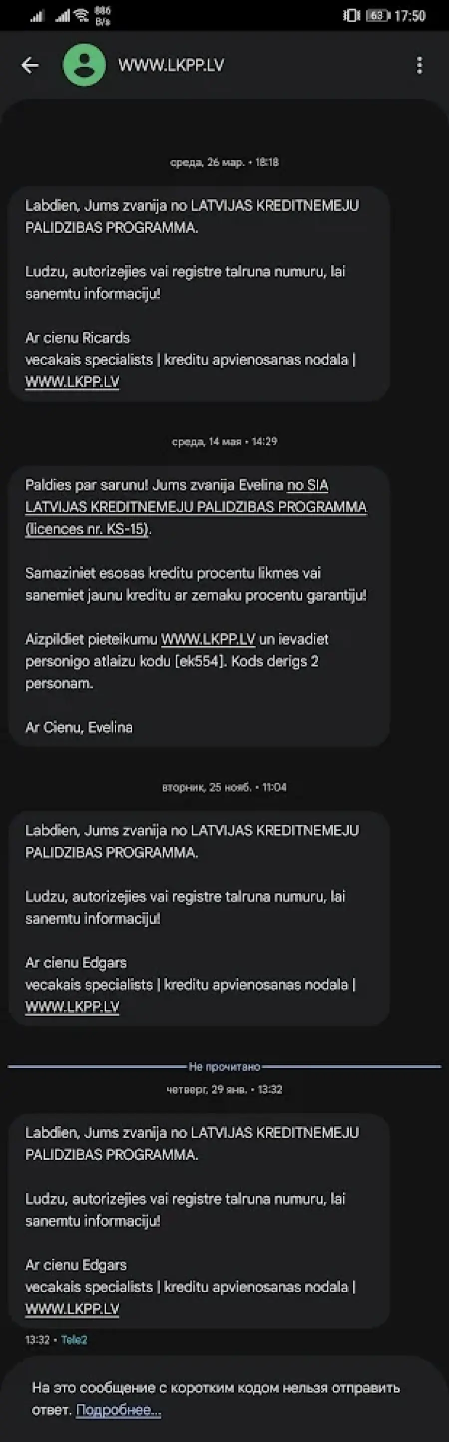 Jau apmēram divus gadus regulāri saņemu zvanus un SMS no “Latvijas kredītņēmēju palīdzības programma (LKPP)” no dažādiem numuriem (64 444 440, 64 444 441, 64 444 446 u.c.).