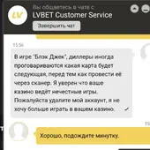 Онлайн казино lvbet.lv ведёт нечестную игру! В игре "Блэк Джек" диллеры иногда называют номинал карт перед тем как провести их через сканер, это говорит о том что игры в lvbet полностью контролируются и отображаются на компьютерах диллеров! Если не хотите потерять свои деньги и потратить нервы не играйте в онлайн казино LVBET.LV!