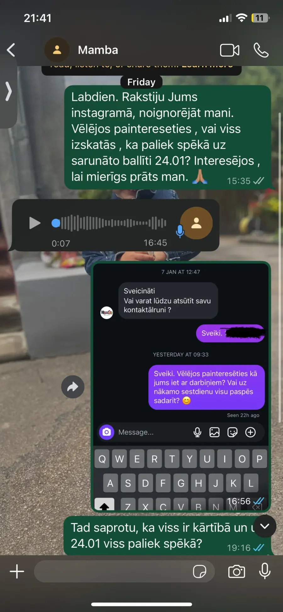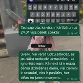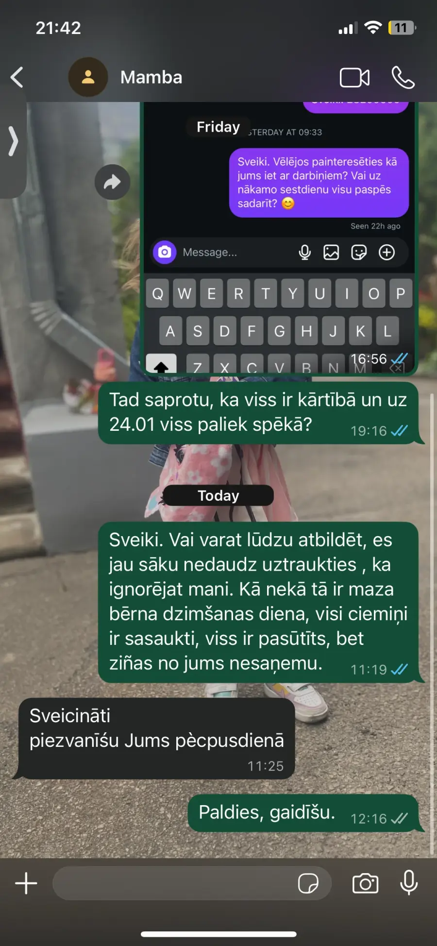 Nākamajā dienā rakstīju vēlreiz – sakot, ka noignorējāt manu ziņu iepriekšējā dienā, un atkārtoti jautājot, vai viss paliek spēkā, saņēmu atbildi - ka uz visām ziņām tika atbildēts , bet līdz manīm tā vienkārši neaizgāja, kā arī uz jautājumu , vai viss paliek spēkā, tā arī netika sniegta atbilde. Pa brīvdienām klusums, paliek mazāk, kā nedeļa lîdz bērna dzimšanas dienai.
