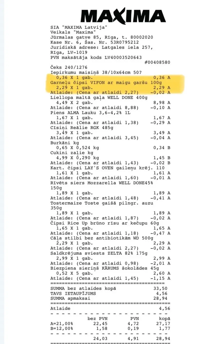 Esmu ļoti neapmierināta un nikna, jo 07.02.2026 iepērkos Maxima veikalā - Jūrmalas gatve 85, Rīgā. Viens no produktiem, kuru nopirku, bija garneļu čipsi.