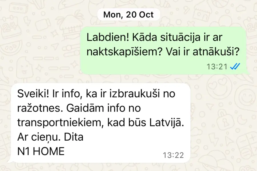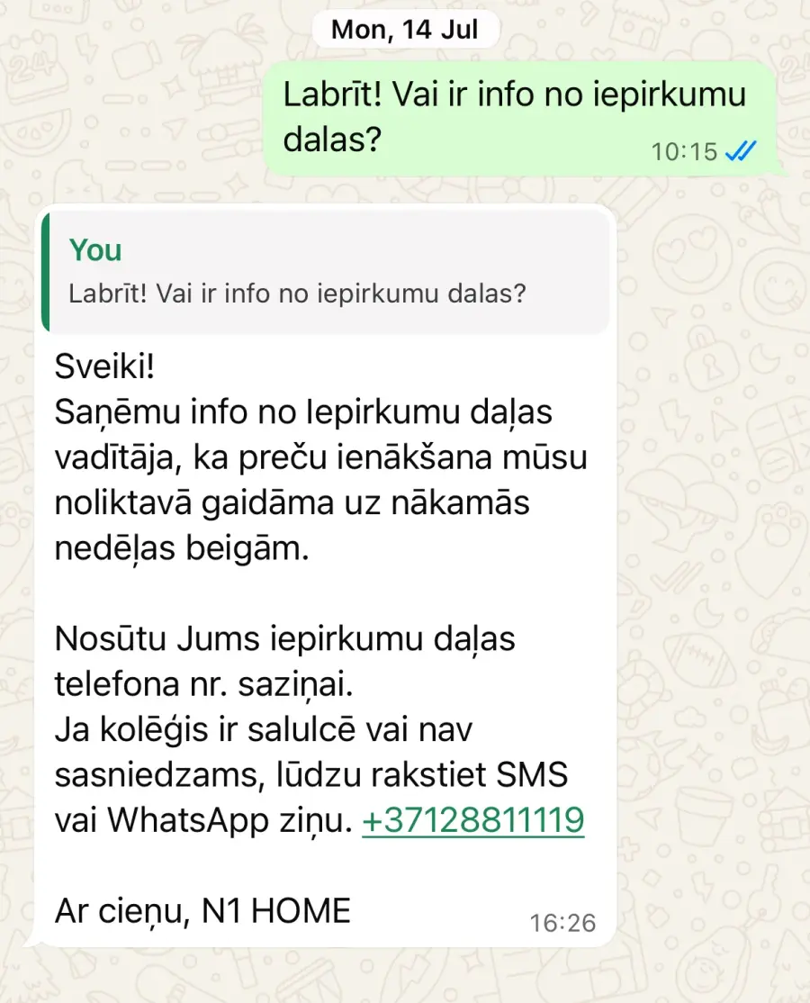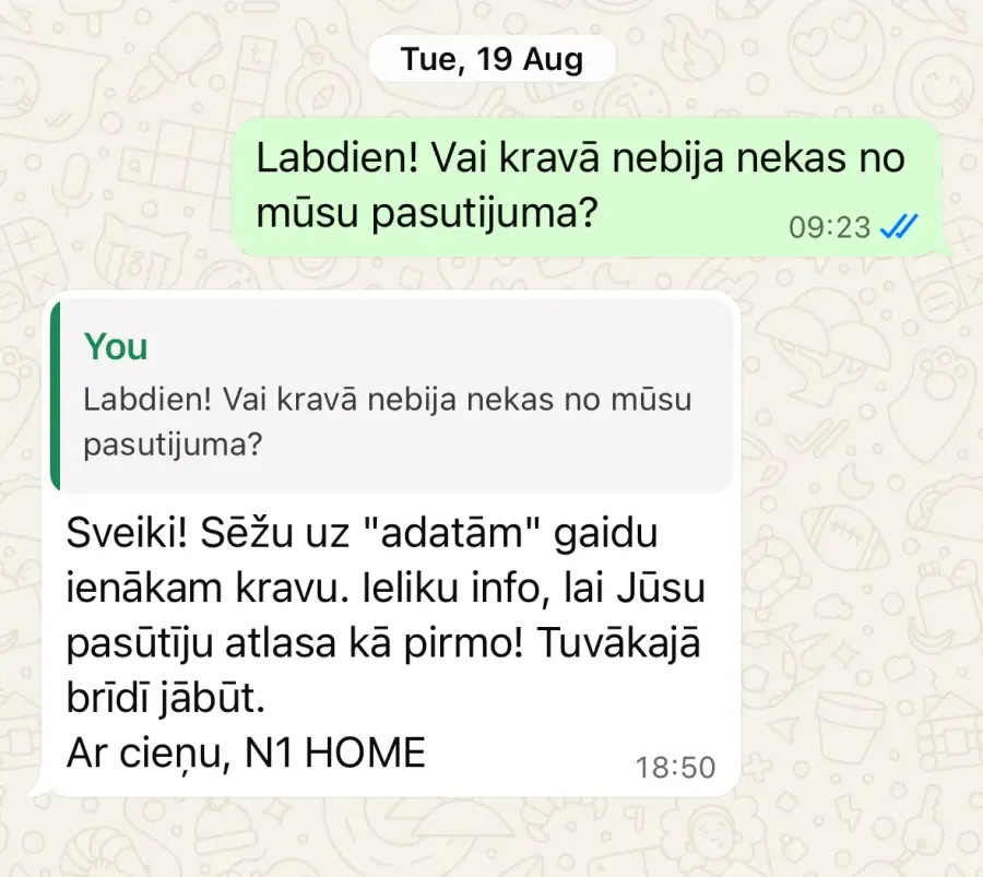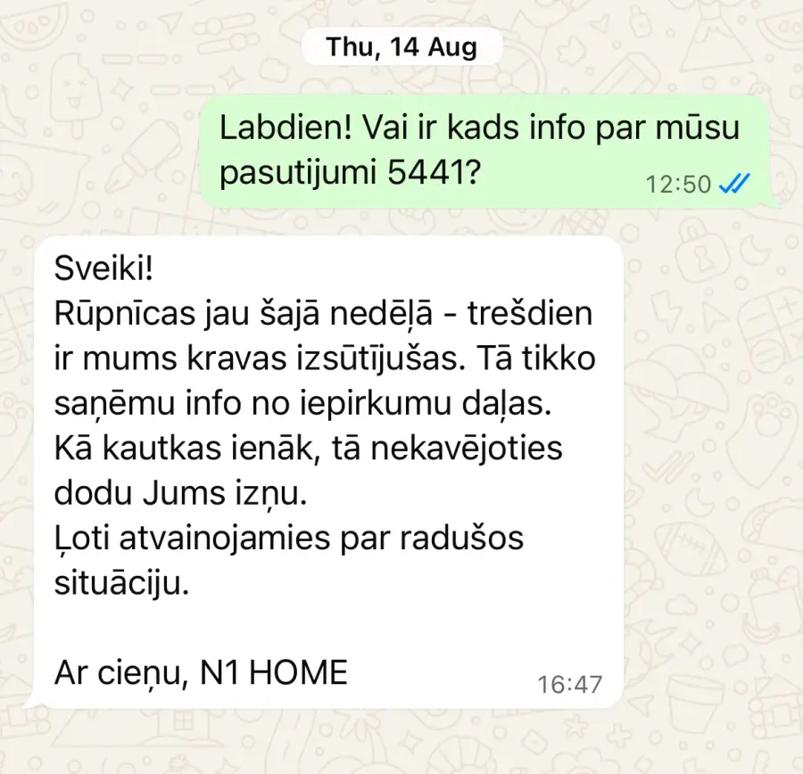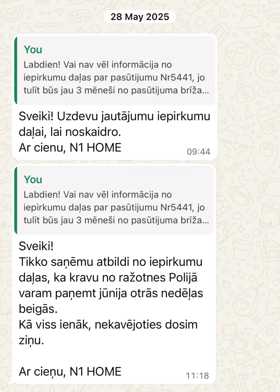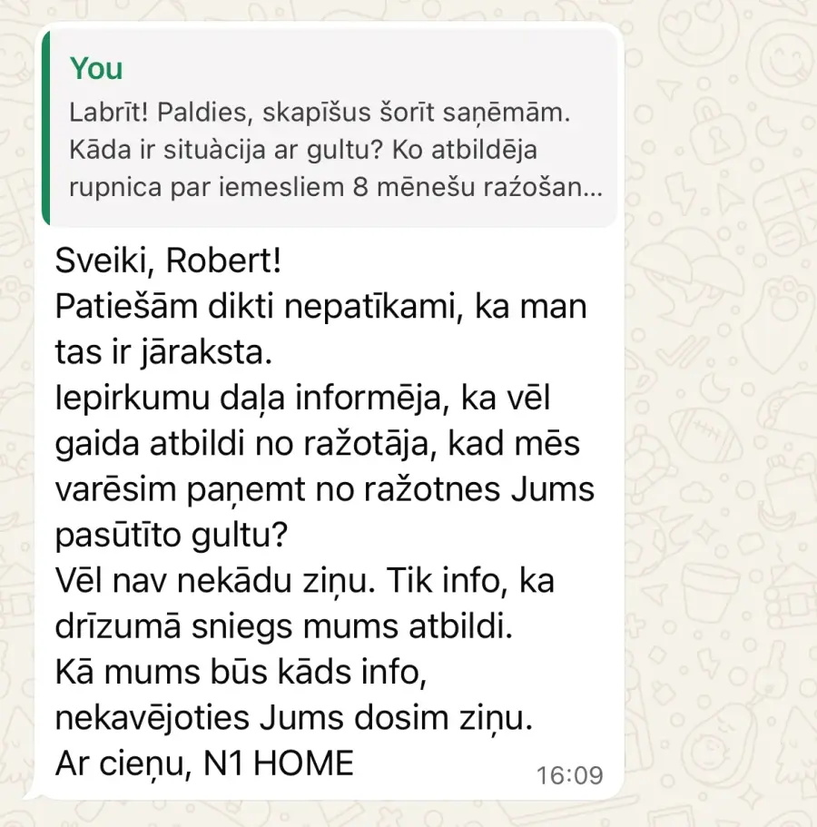 Neiekrītiet uz krāpniekiem. Paņem avansus un nepiegādā preces. Šobrīd piegādi gaidām jau demito mēnesi, kopš apmaksas un pasūtījuma veikšanas 2025 gada februārī. Pirmā daļa no pasūtījuma atnāca ar sešu mēnešu kavēšanos. No 3 precēm viena bija brāķēta, viena nepareizā krāsā. Lietu nodevu juristiem, lai vēršas patērētāju aizsardzības birojā, lai pasargātu citus cilvēkus no krāpniecības. Pielikumā sarakste ar N1Home, lai citi cilvēki neiekrīt uz šo uzņēmumu un tā vadītājiem.