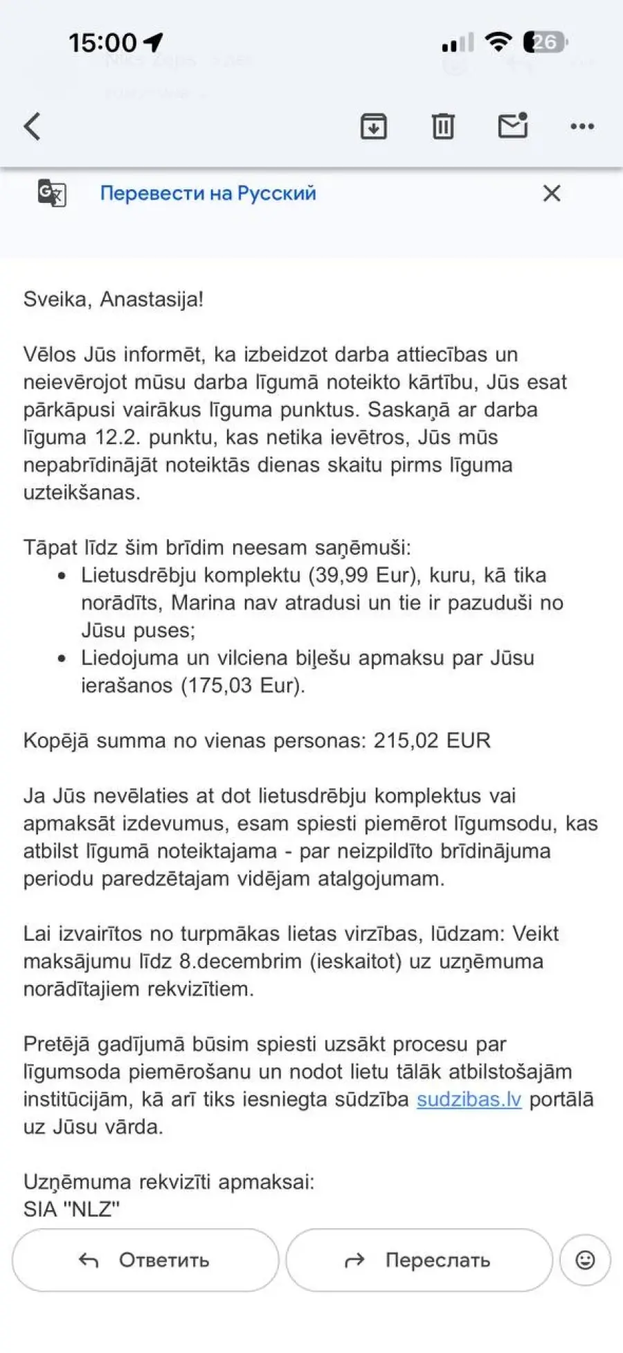 Pēc atteikšanās dzīvot šādos apstākļos uzņēmums NLZ sāka pieprasīt samaksu par darba apģērbu, kas palika darba vietā. Vienlaikus tika paziņots, ka apģērbu “nav iespējams atrast”, kas rada nopietnas šaubas par pieprasītās maksas pamatotību.