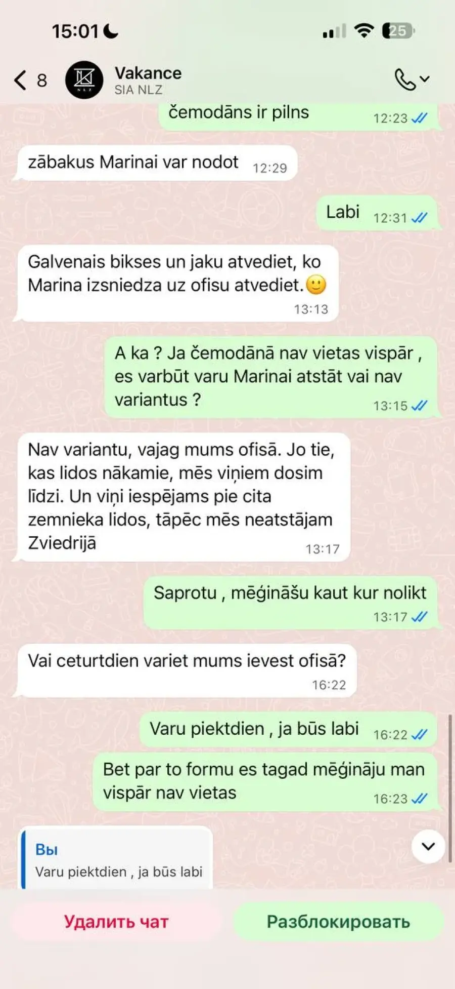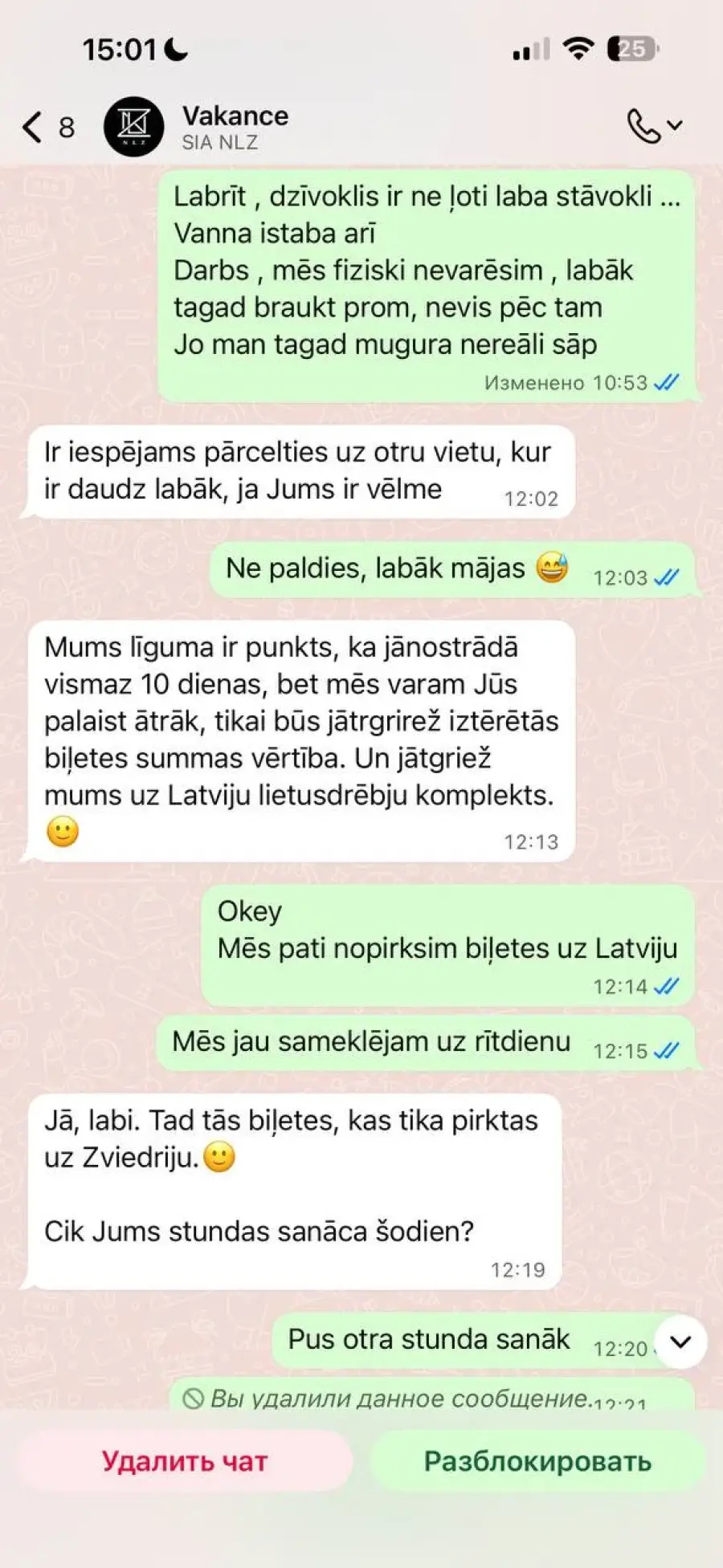 Tāpat darba pārtraukšanai mums tika dots oficiāls apstiprinājums, taču šobrīd tiek mēģināts piemērot sodu. Nav saprotams, par ko šis sods tiek piemērots, jo es par atpakaļceļa biļetēm jau samaksāju 300 eiro, dzīvoju nepiemērotos un nedrošos apstākļos, kā arī darba dēļ savainoju muguru. Neskatoties uz to, no mums vēl tiek prasīta papildus samaksa, kas ir nepamatota un netaisnīga