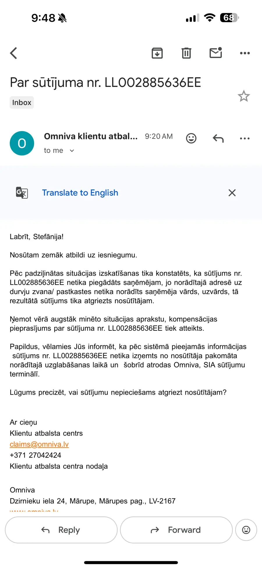 Atgriezana par nesanemtu sutijumu iesniegumu faila formä iesütis tulit pat uz epastu, kas tika nodiktëts 3x pa telefonu, paiet 1 stunda pēc sarunas nekädu epastu neesmu sanēmusi, rakstu tad pati viniem e-pastu, jo pa telefonu neko nevar panākt. Tad nu lük vel nedēla pagajusi sanemu atbildi, ka naudu neatgriezis jo sanēmejam uz durvim/pastkastites nebija rakstits vards, un ka laicigi neesmu sütijumu iznēmusi, es jau vairs nemaz vinu neiznemsu varat aizrities draugi, pietiek ka jau -10 eiro. esmu minusã, vel 10 maksat par savas pacinas iznemsanu ie neprats . Ar Latvijas pastu tãdas problēmas nav, atnäk sütijums, vienkarsi atpaka,, bez nekadam papildus samaksãm. Omniva mantrausiga igaunu kompãnija.
