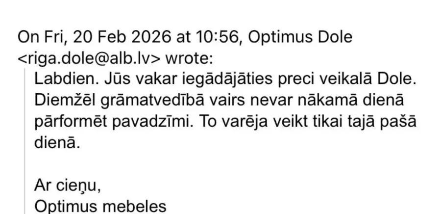 Vakar, 19. februārī plkst. 18:00, bijām Doles Optimus Mēbeles filiālē, kur iegādājāmies biroja datorkrēslu. Pirms pirkuma veikšanas informējām abas darbinieces, ka obligāti nepieciešams PVN rēķins - pavadzīme ar pilniem pircēja rekvizītiem – vārds, uzvārds un personas kods – jo šo pirkumu apmaksās darba devējs. Darbinieces paskaidroja, ka šobrīd viņām nedarbojas sistēma datorā kā nākas, tāpēc ieteica veikt pirkumu uzreiz ar kases čeku, bet nākamās dienas laikā grāmatvedība atsūtīs elektronisko pavadzīmi/rēķinu ar mums nepieciešamajiem datiem. Nākošajā dienā neviens ar mums nesazinājās, kaut gan bijām atstājuši visu INFO šīm abām darbiniecēm, pēc atkārtotās saziņas, jeb, kad paši jau zvanījām atgādināt mums pateica, ka to vairs izdarīt nevar, kaut gan darbinieces SOLIJA, ka tas tiks izdarīts. Šobrīd sūdzēsimies tālāk vajadzīgajās instancēs un paskatīsimies cik ātri veikala vadība ar mums sazināsies. Potenciālie mēbeļu pircēji ņemiet vērā šo mūsu pieredzi un padomājiet divreiz ejot uz šo veikalu.