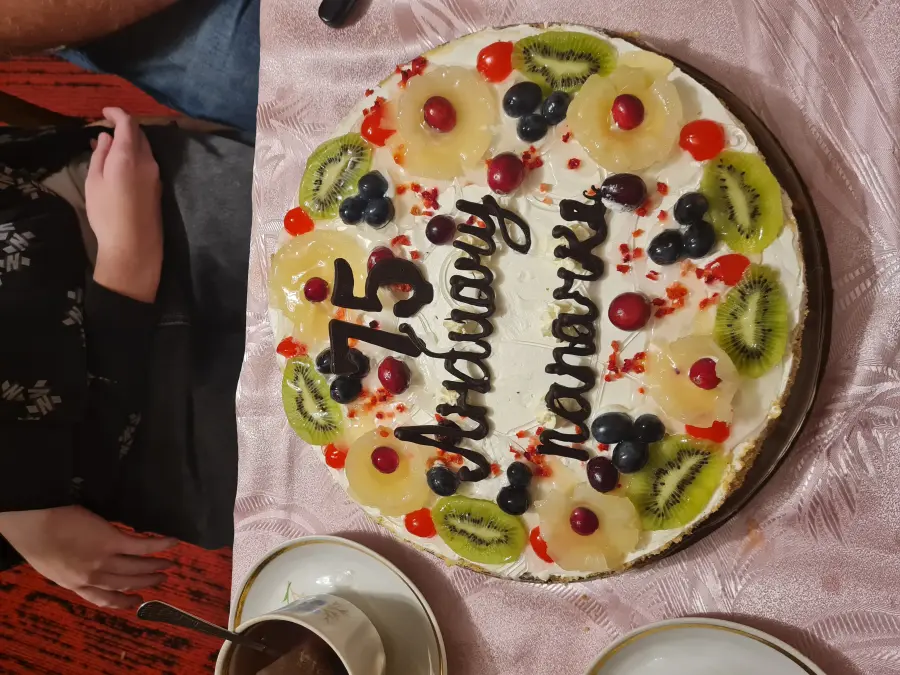Pa telefonu ar darbinieku tika saskaņots tortes sastāvs un uzraksts. Es pat precizēju, vai viņi varēs uzrakstīt krieviski — atbildēja: jā, protams. Nosūtīju SMS ar tekstu, ko tieši vajag uzrakstīt, un vajadzēja uzrakstīt Любимому папочке 75. Rezultātā šajos divos vārdos bija trīs kļūdas. Manis lūgto, lai sastāvā būtu vairāk putukrējuma, viņi vispār ignorēja. Nevaru saprast, vai konditors ir tik negudrs, vai vienkārši krievus ļoti nemīl un nolēma sabojāt garastāvokli svētku dienā. Torte arī nebija tik garšīga.