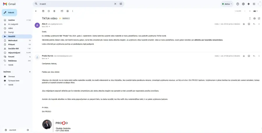 Atsevišķs aspekts — video, kuros es piedalos. Darba laikā tika ierakstīti vairāki video, par kuriem netika maksāts un kuri tika filmēti bez iebildumiem. Pēc sadarbības beigām es pieklājīgi palūdzu tos vai nu dzēst, vai piedāvāt kompensāciju, ja uzņēmums plāno tos turpināt izmantot. Atbilde bija vienkārša — mani aizsūtīja prom rupjā formā.