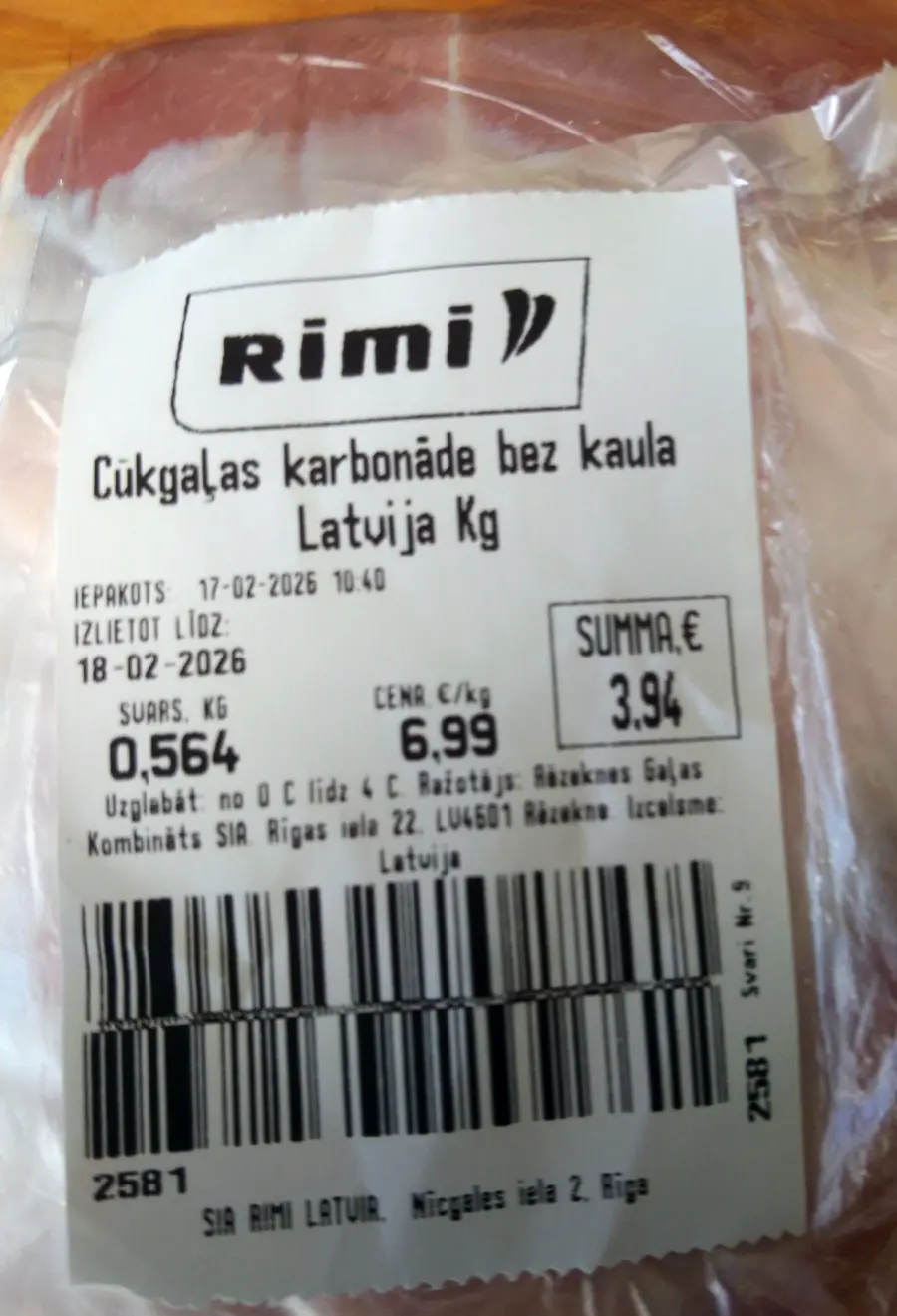 Rimi akciju bukletā Nr.8 no 1702.2026. līdz 23.02.2026. norādīts - Cūkgaļas karbonāte bez kaula un ādas, 1 kg, atlaide - 53% 3,25 EUR (6.99 EUR). Š.g. 17,02. veikalā Rimi, Nīcgales ielā 2, Rīga, nopirku minēto produktu par 6,99 EUR/kg. Šaubos par bukletlā uzrādītās informācijas patiesumu.
