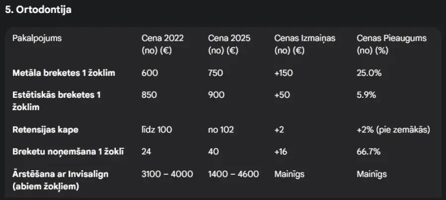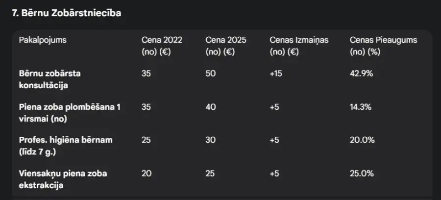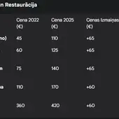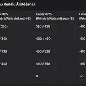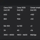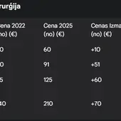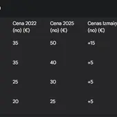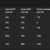 Pakalpojums Cena 2022 (€) Cena 2025 (€) Cenas Izmaiņas (€) Cenas Pieaugums (%)
