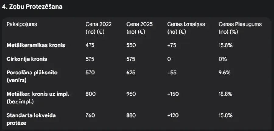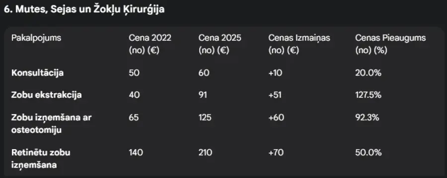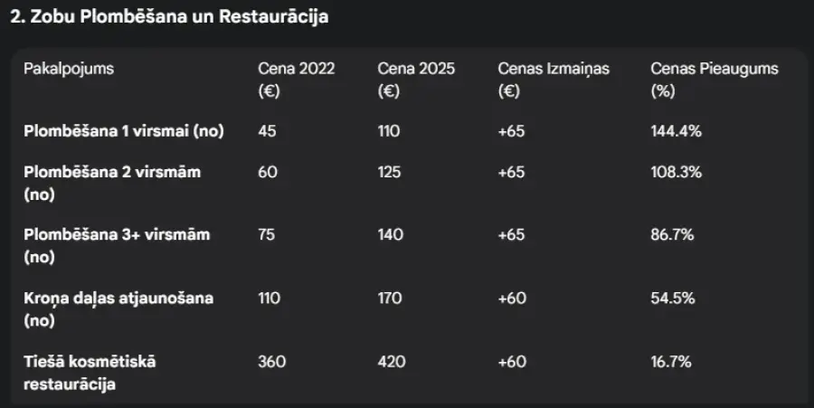 SI Zobārstniecības klīnikā 2022. gada oktobrī zobu plombēšana "Vienai virsmai ar gaismā cietējošu kompozītu" izmaksāja no ~45 Eiro, bet 3 GADUS VĒLĀK - 2025. gada novembrī šim pašam pakalpojumam cena nu jau ir uzaugusi par 65 EUR! Tas ir 110 EUR!