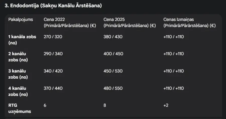 RSU Stomatoloģijas institūts - Zobārstniecības cenu kāpums - 1 virsmas plombe €45 (2022. gadā) -> €110 (2025. gadā)