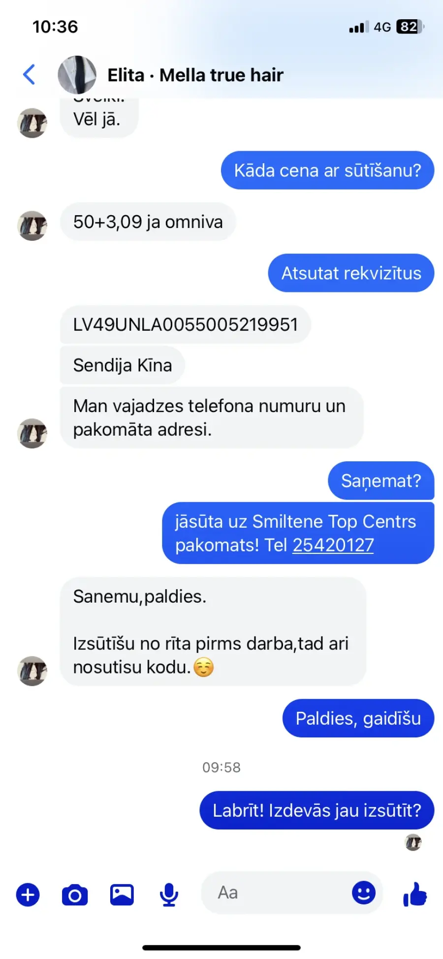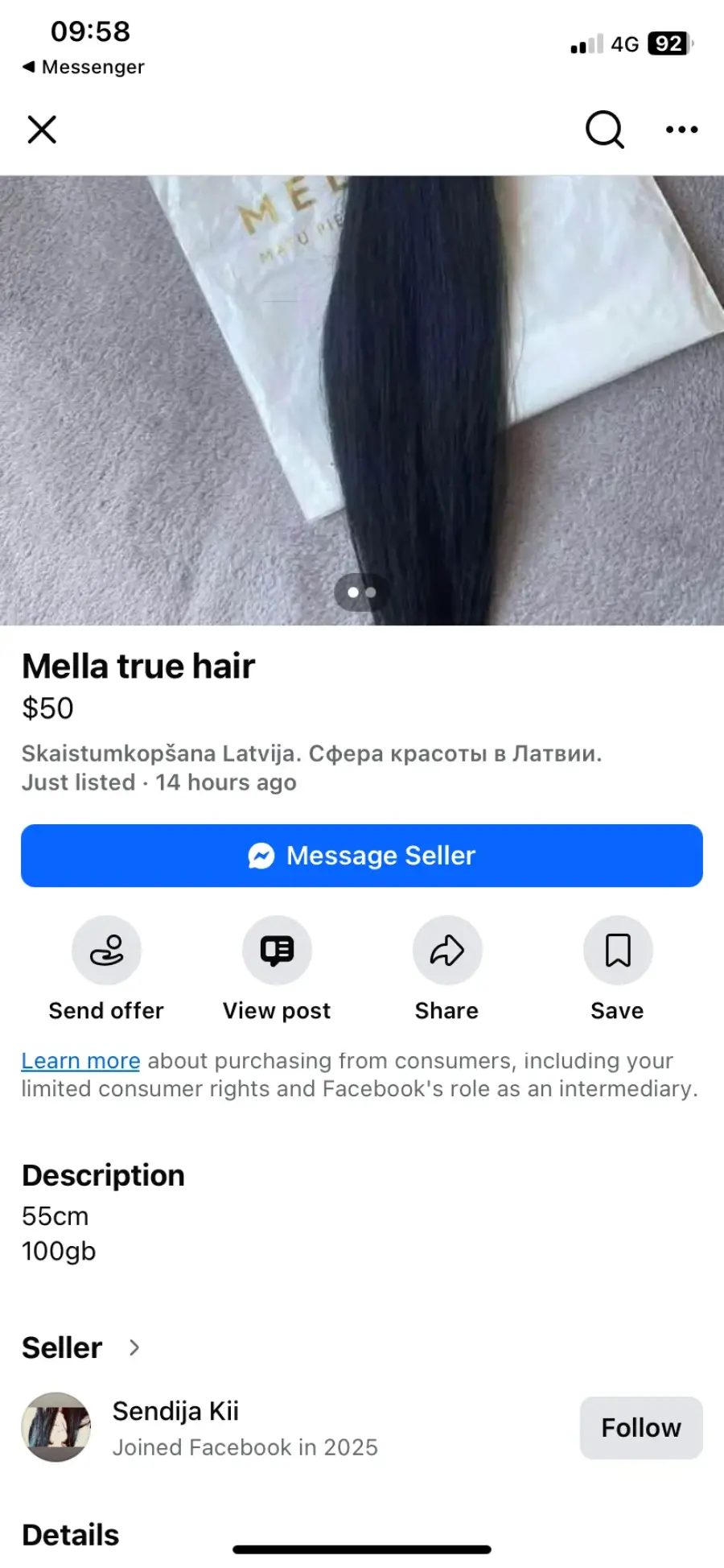 13.01 iegādājos Mella true hair pieaudzejamos matus no Sendija Kii (Sendija Ķīna) 50€+ 3.09€ Omnivas izmaksas! Šodien centos sazinaties par izsūtīšanu, komunikācija pilnīgi nekāda! Uz telefona zvaniem neatbild, messenger neatbild, visur tiku nobloķēta! Sludinājums joprojām aktīvs, papētot bildes interneta sludinājums pārkopēts pavisam no cita tirgotāja! Ir visi Screenshoti.