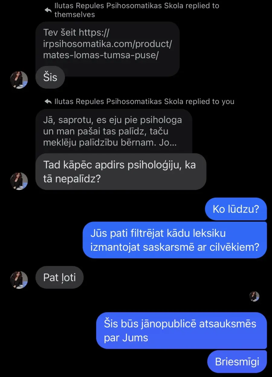 Izrādot neizpratni par šādu noteikumu, tiku bloķēta un pēcāk publiski nosaukta par neadekvātu. Sevi cienošs uzņēmums vai pakalpojumu sniedzējs konflikta situācijas risina diplomātiski, ka minimums neapsaukājot pretenzijas sniedzēju. Uzskatu, ka Ilutas Repules rīcība ir neprofesionāla un pakalpojumu sniegšana terapijas jomā nav kvalitatīva, jo metode balstīta tikai uz vienu (viņas) taisnību.