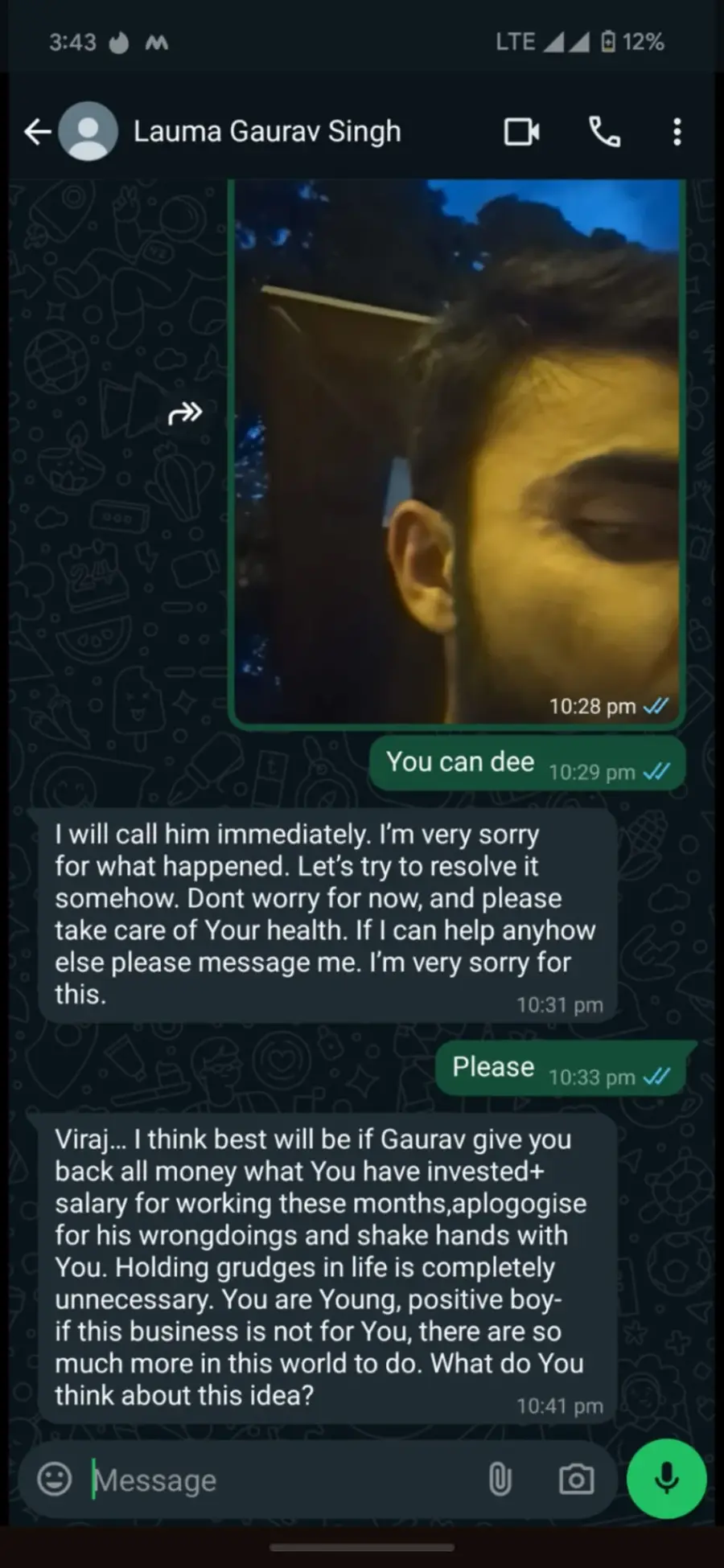 The combination of financial loss, physical assault, and refusal to acknowledge my rightful share has caused significant personal and financial harm. I am fully prepared to provide all supporting evidence, including bank transfers, video footage, screenshots of messages, and statements from witnesses.