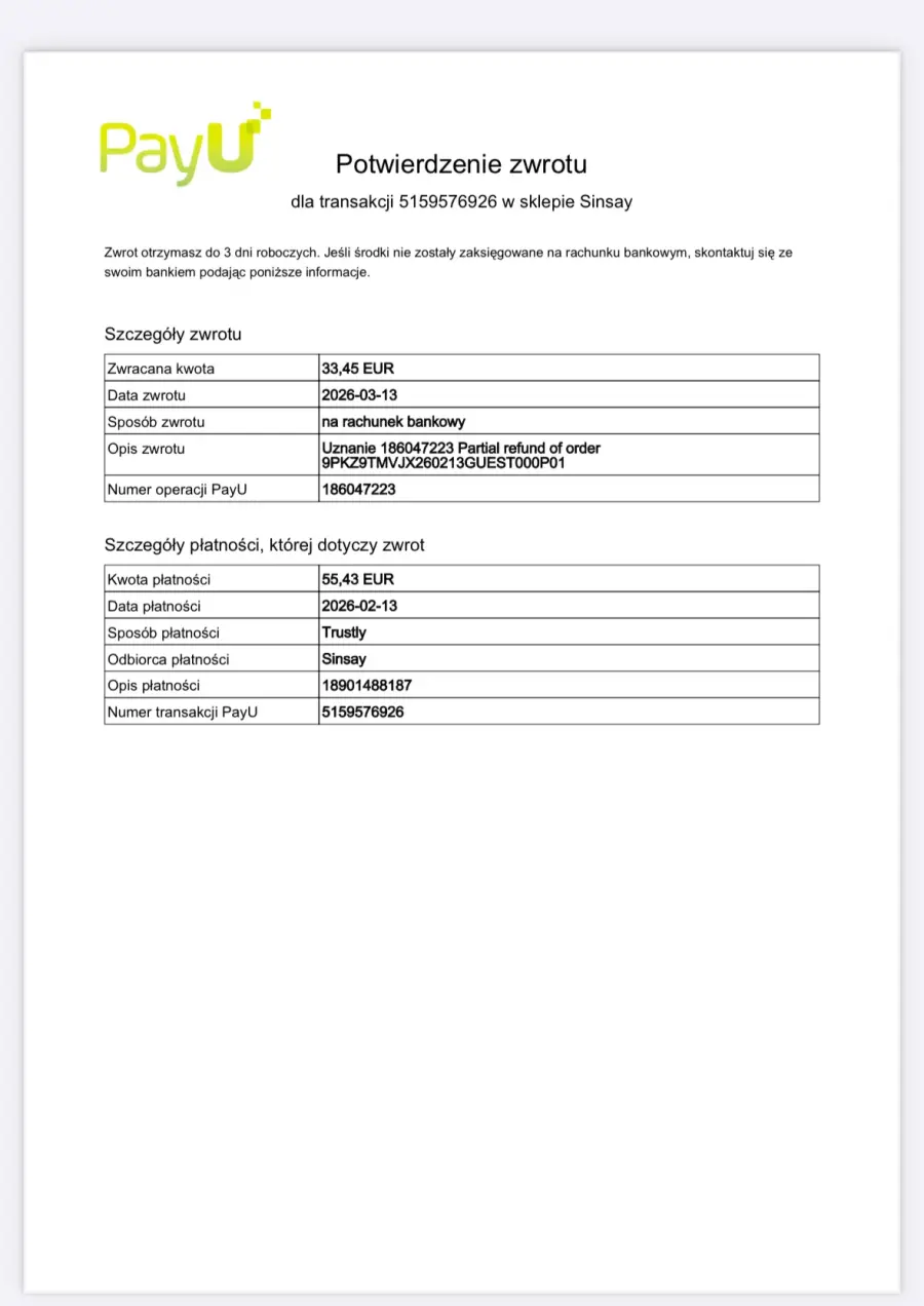 2026.gada 13.februārī veicu pasūtījumu NR.18901488187 (55.43 EUR). 2026.gada 19.februārī tika izveidots atgriešanas pieprasījums (preču vērtība 33.45 EUR). Atgriešanas statuss skaitās pabeigts 2026.gada 13.martā - BET NAUDA NAV ATGRIEZTA! Sazinoties ar sinsay - saka, gaidiet - būs, bet nav. Sazinoties ar banku, nauda nav ienākusi. Mistiska tabula no sinsay, kur itkā norādīts, ka veikta naudas atmaksa, bet uz kuru kontu, nav norādīts. Joprojām gaidu naudu, un paskaidrojumu, uz kuru kontu ITKĀ veikta naudas atgriešana!