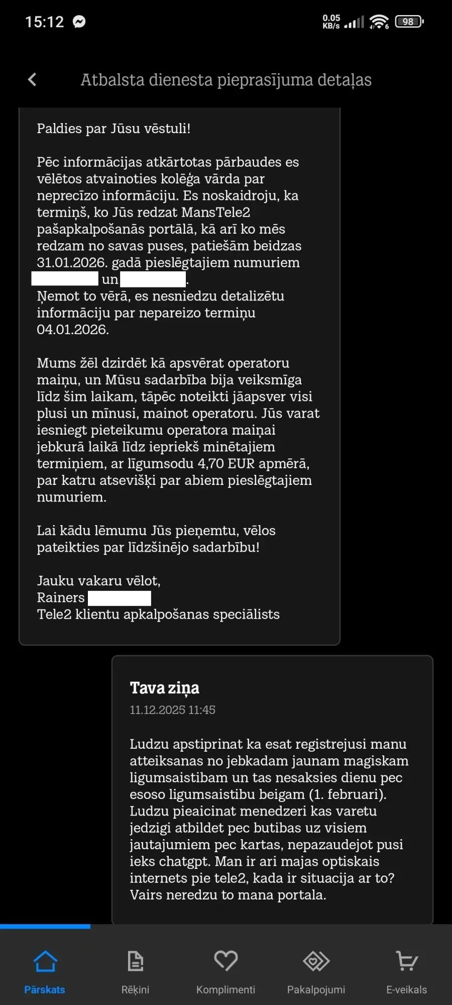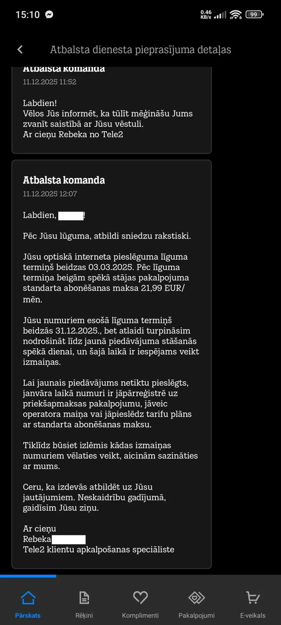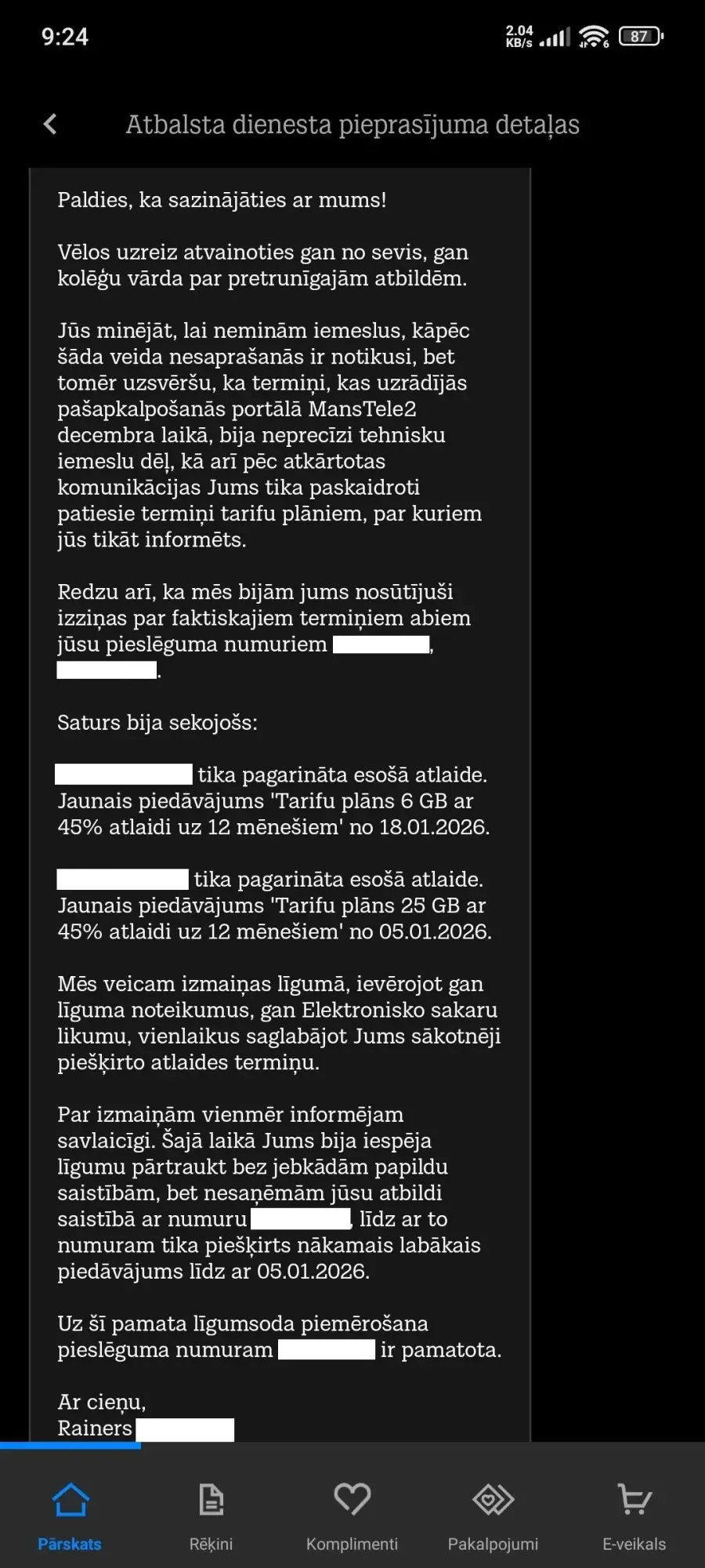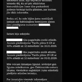 Daudz vārdu un tukšu atvainošanos. Maz saprašanās un skaidrības. Pieslēdza tarifu ar līgumsaistībām, ignorējot savlaicīgu skaidru atteikumu no jebkādām atlaidēm.
