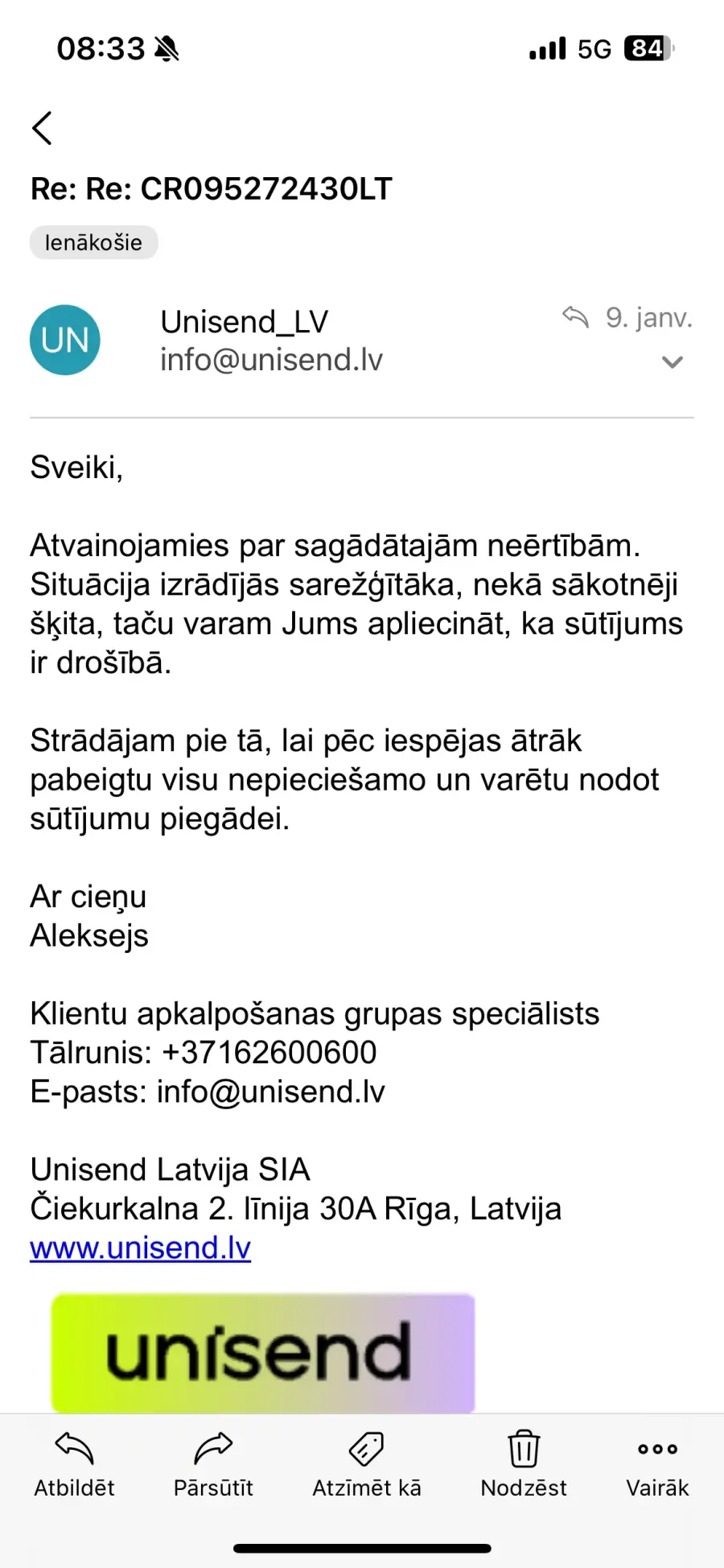gribu padalīties ar savu pieredzi unisend un cik neuzticāms ir šīs pārvadātājs! Mazums tas, ka viņi var nozaudēt sūtījumu, bet arī negrib izņemties atbildību, kau arī ir skaidrs, ka problēma ir tieši viņu pusē!