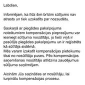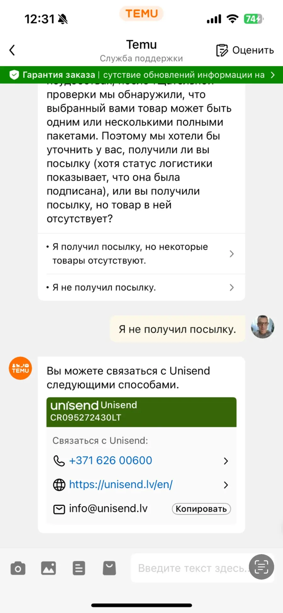 Nobildēju tukšumu un uzrakstīju e-pastu unisend ar to, ka mana sūtījuma nodalījumā nebija (prtsc pielikumā) , uz ko man unisend atbild, ka noskaidros. Nākamajā dienā viņi raksta, ka joprojām nav atrasts, bet apliecina, ka sūtījums ir drošībā (prtsc pielikumā) . Vēlāk uzraksta, ka ar pretenziju man ir jāgriežās temu (prtsc pielikumā) . Kāds sakars ir temu, ja sūtījumu viņi izsūtīja un pēc izsekošanas viņiem uzrāda info, ka sūtījums ir piegādāts? Bet unisend vienalga sūta pie temu. Uzrakstīju temu, un viņi mani nosūta pie unisend (prtsc pielikumā) . Pievienoju arī cik daudz vēstules es sarakstīju unisend, bet jēgas no tā nav, viņi neuzņemās atbildību, kaut arī te viennozīmīgi ir redzams, ka problēma ir unisend pusē. Un nodalījums nebija bojāts, līdz ar to te neviet runa par apzagšanu.