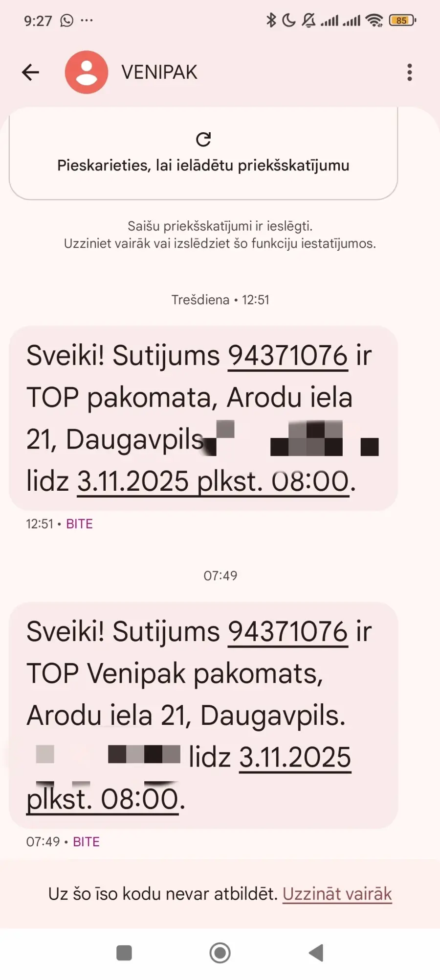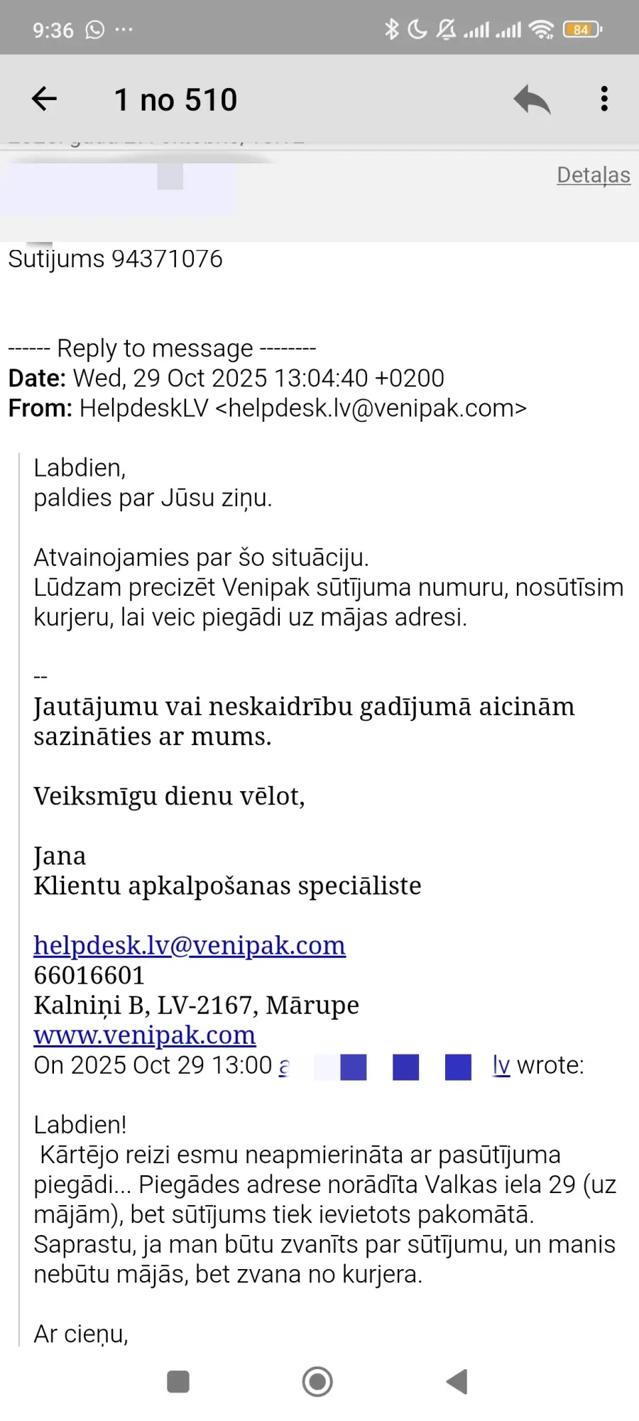 au kuro reizi pasūtījumu veicu ar piegādi uz mājām, beigās atsūta ziņu, ka pasūtījums ievietots pakomātā. Man nezvanot, nejautājot vai drīkst atstāt pakomātā, vienkārši pēc savas gribas. Uzrakstot venipak par situāciju, saņēmu ziņu, lai atsūtu pasūtījuma NR., lai kurjers tomēr atved uz mājām. Nosūtīju, atpakaļsaikni nesaņēmu. Pēc 2 dienām atkal atnāk ziņa - atgādinājums, ka pasūtījums atrodas pakomātā.