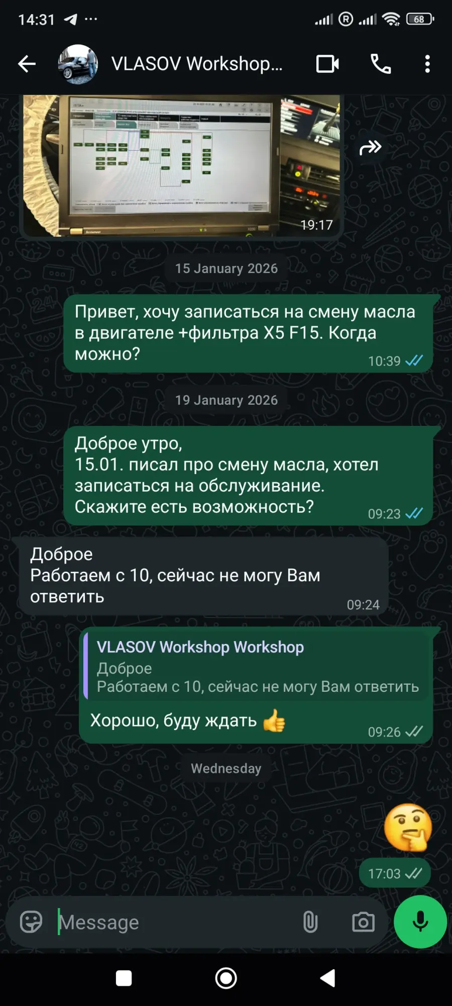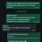 Я заранее написал, чтобы записаться на обычную замену масла и фильтра. Ответа долго не было. После повторного сообщения получил формальный ответ, что они «работают с 10» и сейчас ответить не могут.